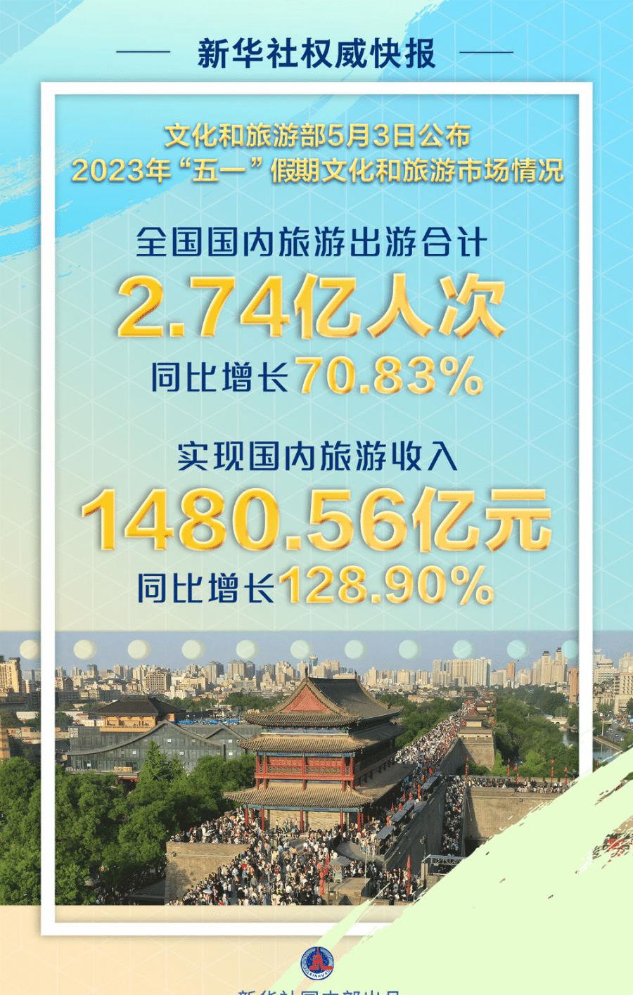 今年五一假期,共接待国内游客2.71亿人次,同比增长70.83%,实现国内旅游收入1480.56亿元,同比增长128.90%。