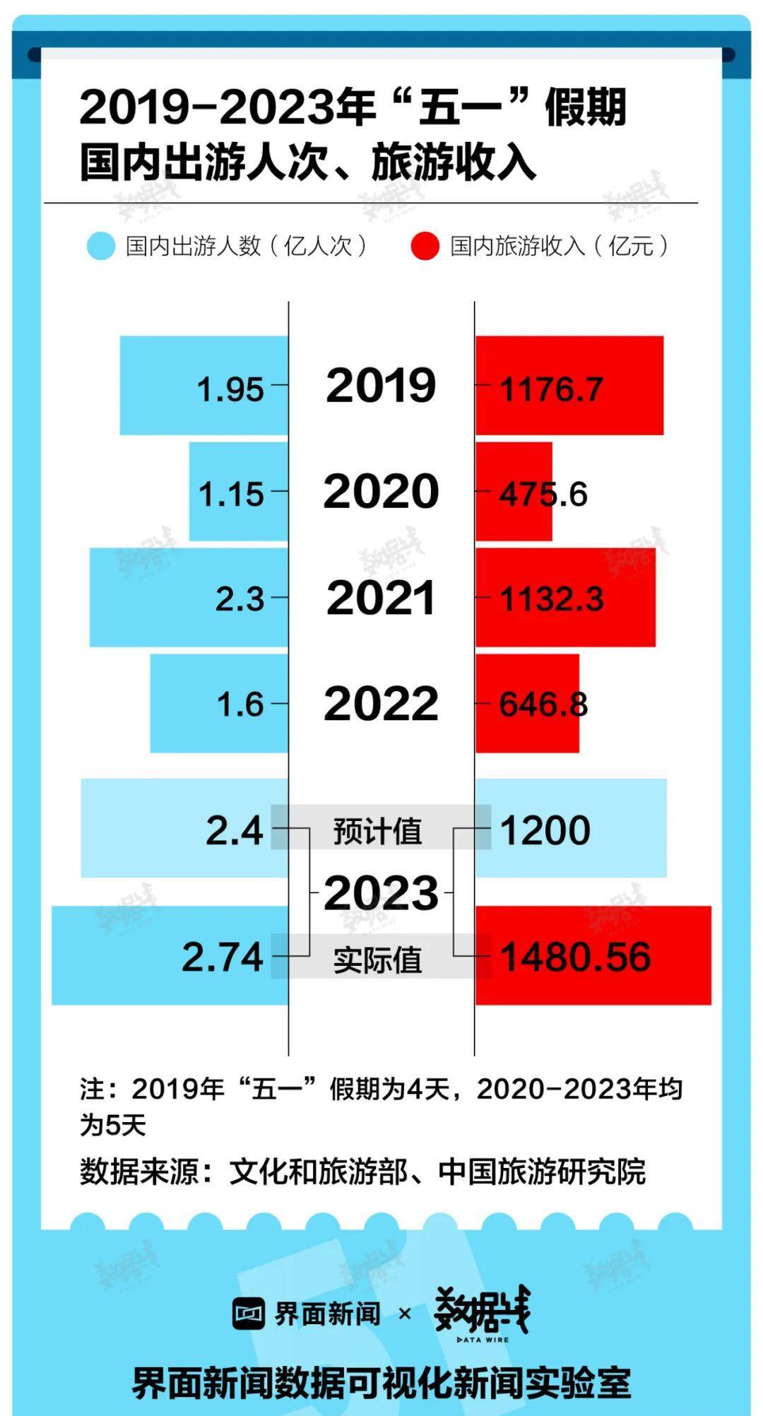 2023年“五一”期间,全国共接待国内旅游2.74亿人次,可比口径恢复至2023年同期的119.09%;国内旅游收入1480.56亿元,按可比口径恢复到2023年同期的100.66%。