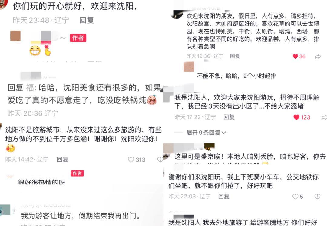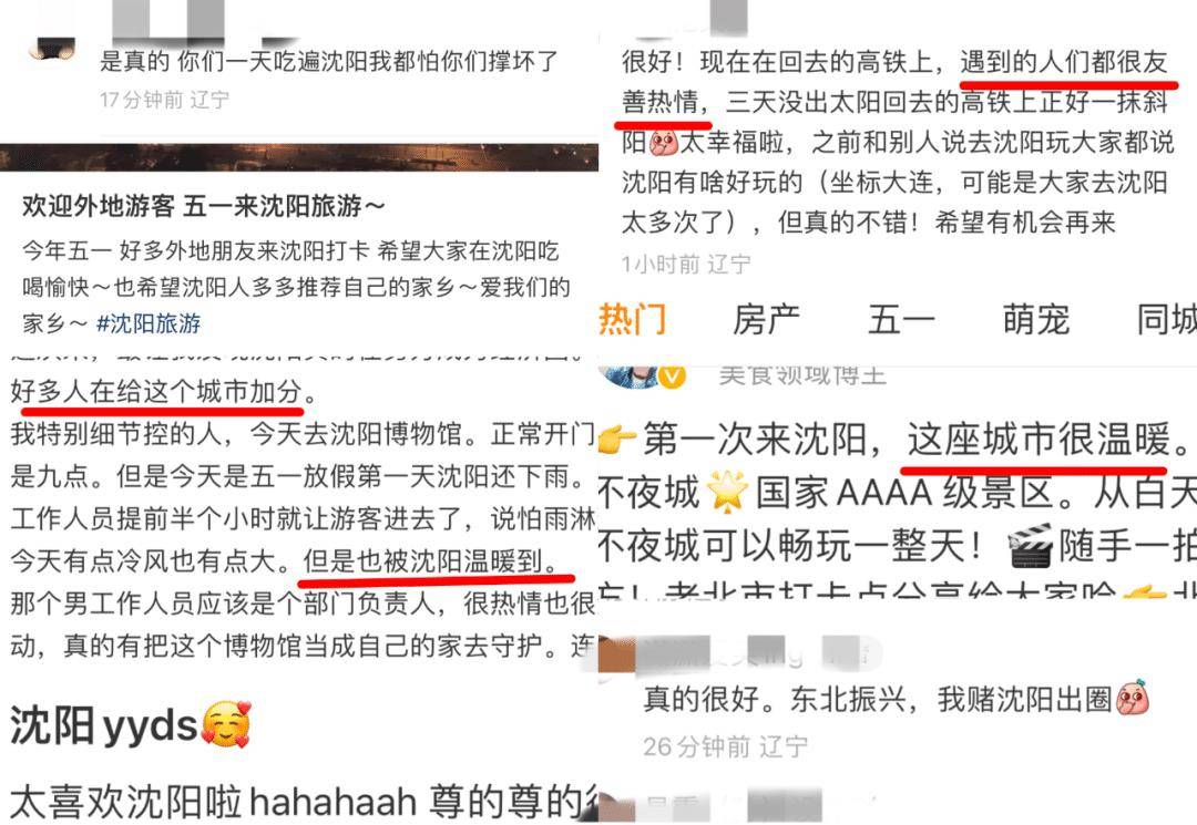 “来沉阳好兴奋”、“真不错,东北振兴了,我相信沉阳会出圈”、“我很喜欢沉阳,食物很好吃,遇到的人都很好”也很热情”,“大沈阳yyds”,“第一次第二次来沉阳,这座城市很温暖”……