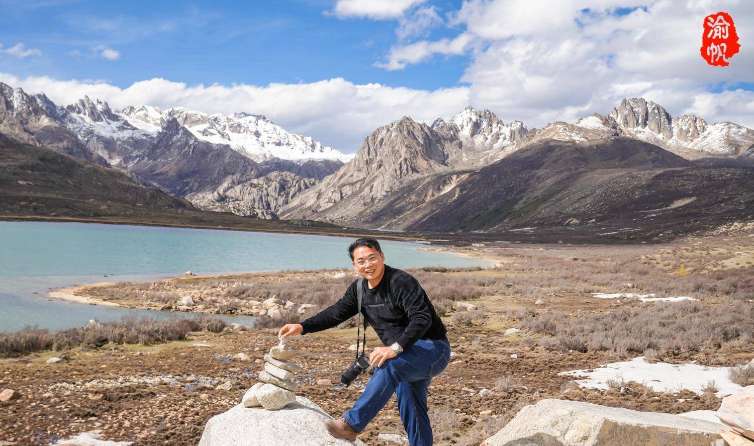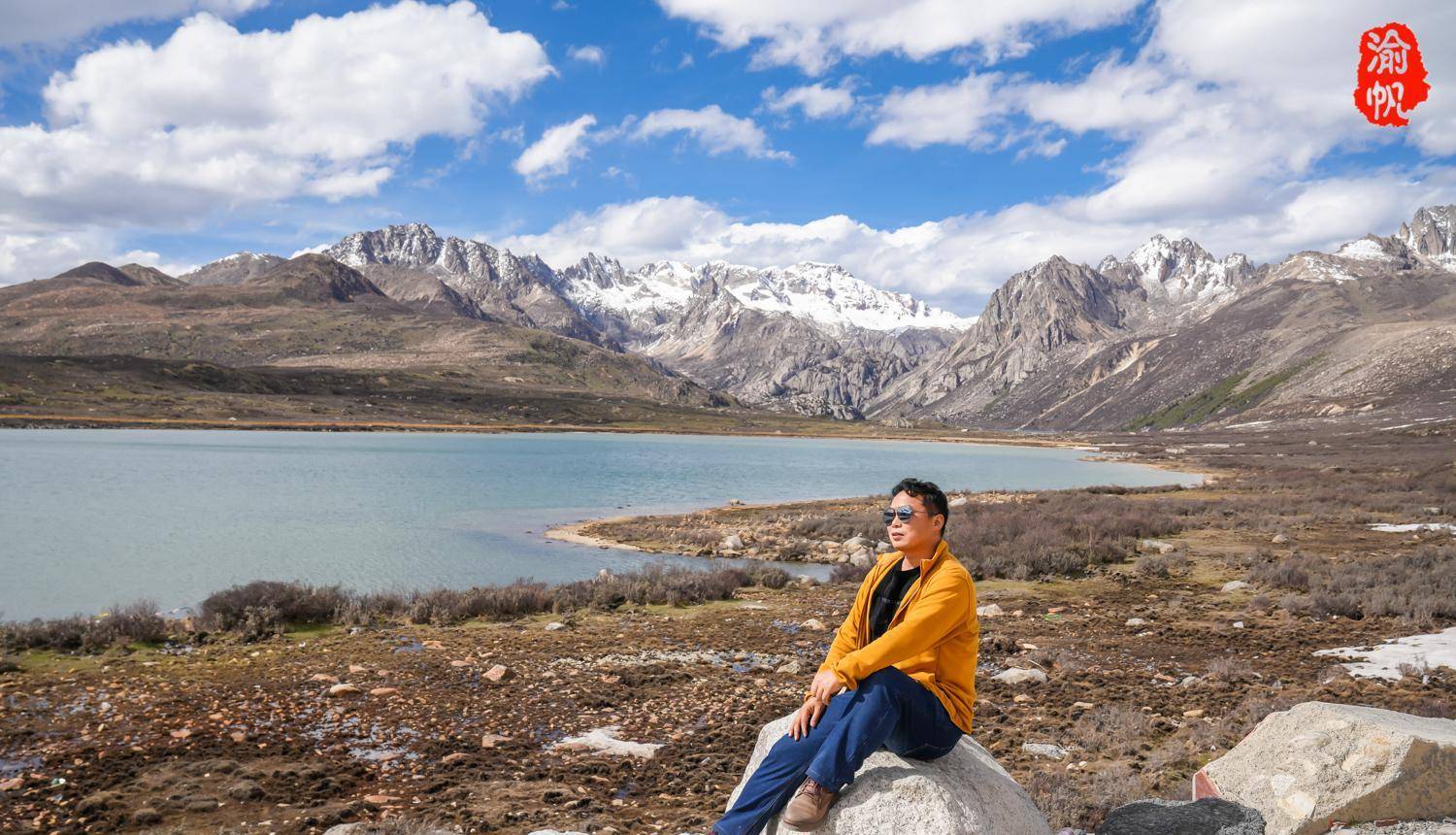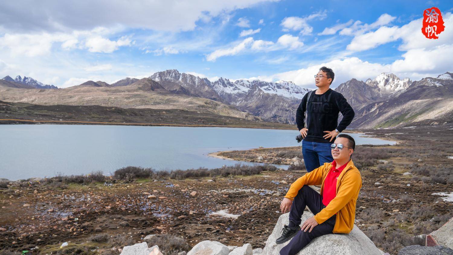 可能是因为湖水深,靠近雪山的姊妹湖是深蓝色的,而外面的姊妹湖是绿色的。远远望去,它们就像两块玉石压在群山之中,分外美丽。有游客路过这里,忍不住停下来和他合影留念。
