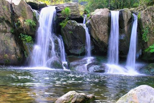 这三叠泉,还真是“千呼万唤始出来”啊,这飞瀑流经的峭壁有三级,所以才叫做三叠泉,它飞泻而下,落差极大。小真显然是有经验了,对着远方的一片水雾,指指点点地说:“一叠垂直,水从高处一倾而下,二叠弯曲,直入潭中,又飞泻到大盘石上,再喷洒到三级盘石,形成三叠。”