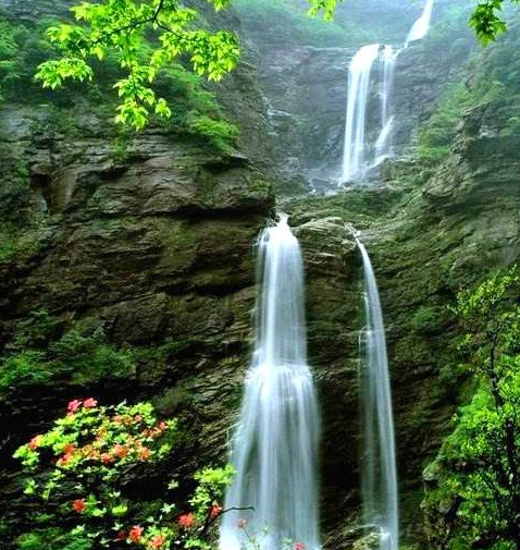 虽然小真说是三叠,但是,在我看来,这水流的三级跳,却是一气呵成,浑然一体,宛如一条悬挂在半山腰的玉带,又好像是戏台上演员穿的长长水袖。它凌空飘舞,势如奔马,声若洪钟,抛珠溅玉,宛如白鹭争飞,又好像是有万斛明珠,从九天之外洒落。“上级如飘雪拖练,中级如碎玉摧冰,下级如玉龙走潭。”这话说得还真是有道理啊。