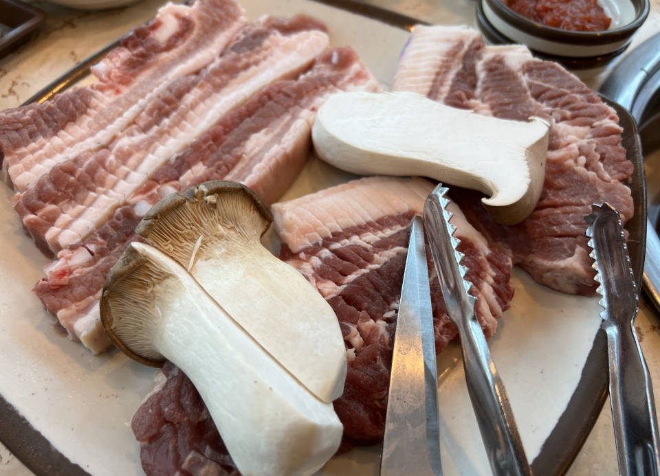 黑猪肉无疑是济州岛一大特产,只有在济州岛,才能吃到正宗的韩式烤黑猪肉。济州岛人杀猪时使用烟熏的方法,用全草退掉猪毛,因此其香味沁润到猪肉里,味道变得别具一格。而且由于黑猪是在草地上自然放养,肥肉很有嚼头,精肉也筋道、营养丰富、没腥味,味道比普通猪肉更香。黑猪肉被切成一厘米厚,把它直接放上丝网烤,等到烤肉七八分熟之后,用锋利的剪刀把肉剪成小块,烤一会儿后,再用生菜叶或苏子叶包着辣椒、蒜、辣酱和烤熟的黑猪肉一起吃,肉质非常的香糯,不腻人,因为在烤制的过程中,多余的油脂已经随着丝网掉落了下去,同时和蒜、洋葱、蘑菇等一起的搭配使营养更易被吸收。
