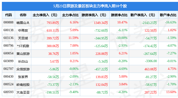 从资金流向上来看,当日旅游及景区板块主力资金净流出8575.29万元,游资资金净流入4619.73万元,散户资金净流入3955.56万元。旅游及景区板块个股资金流向见下表: