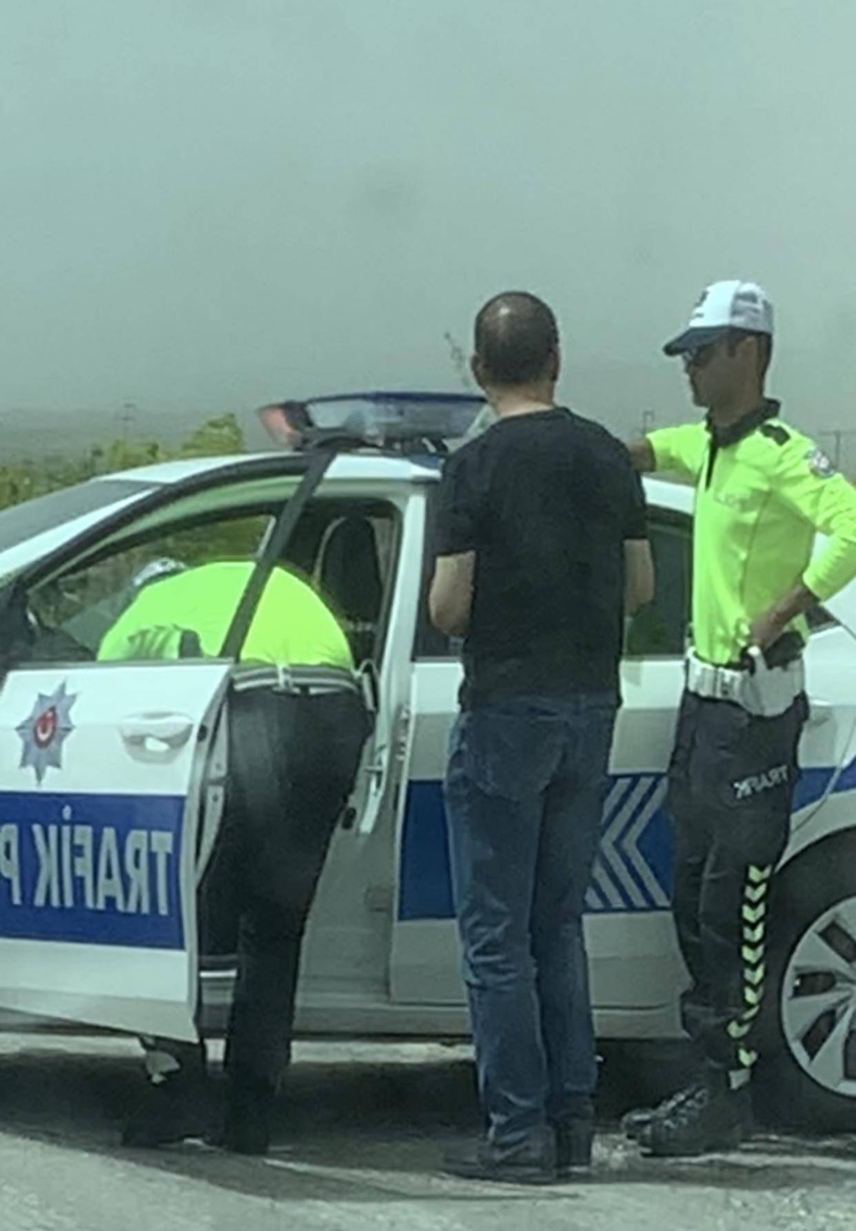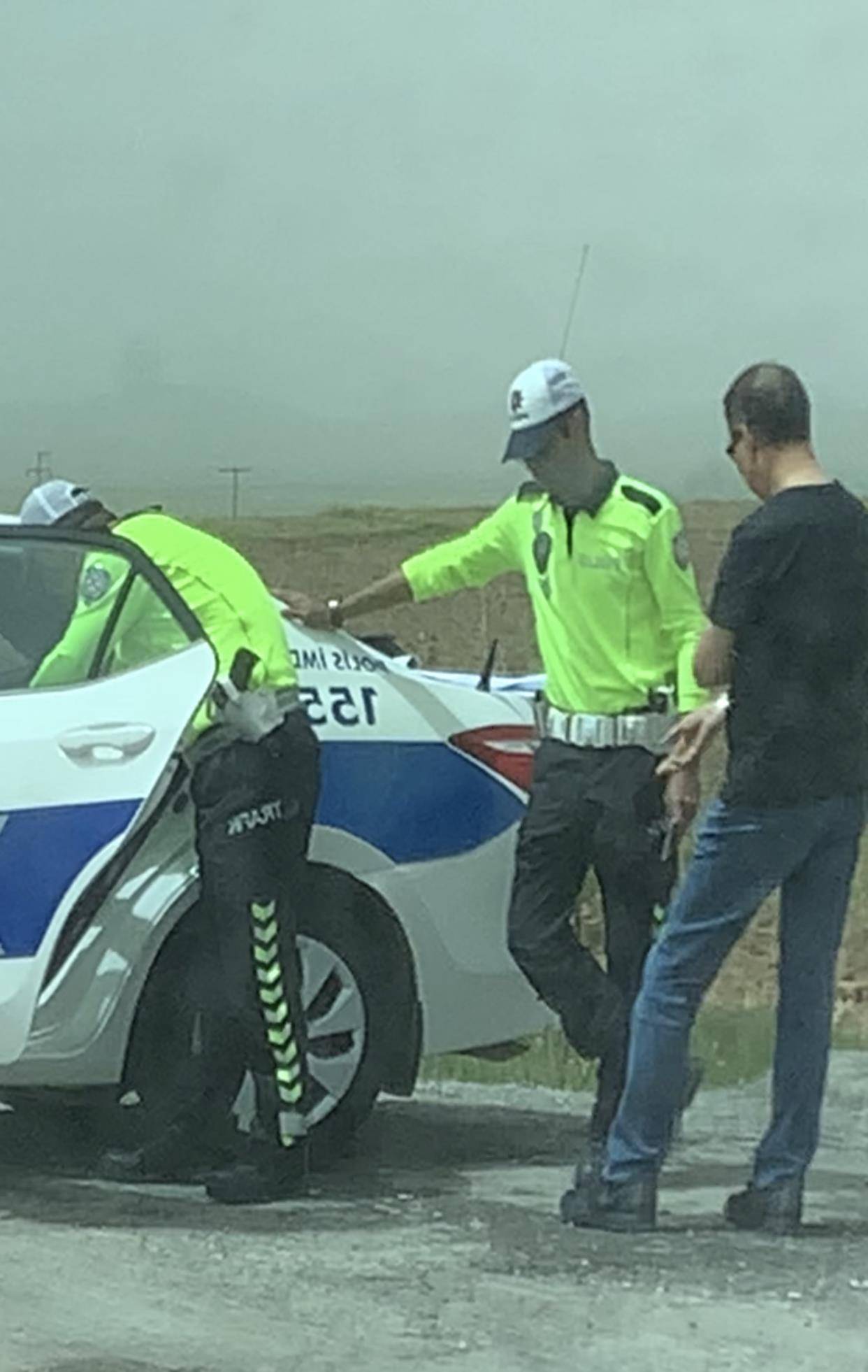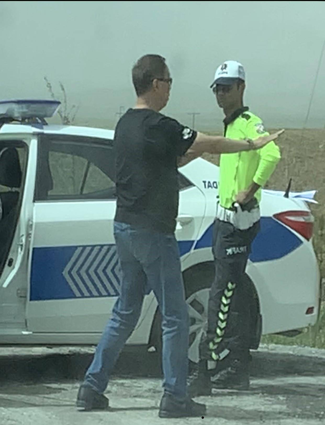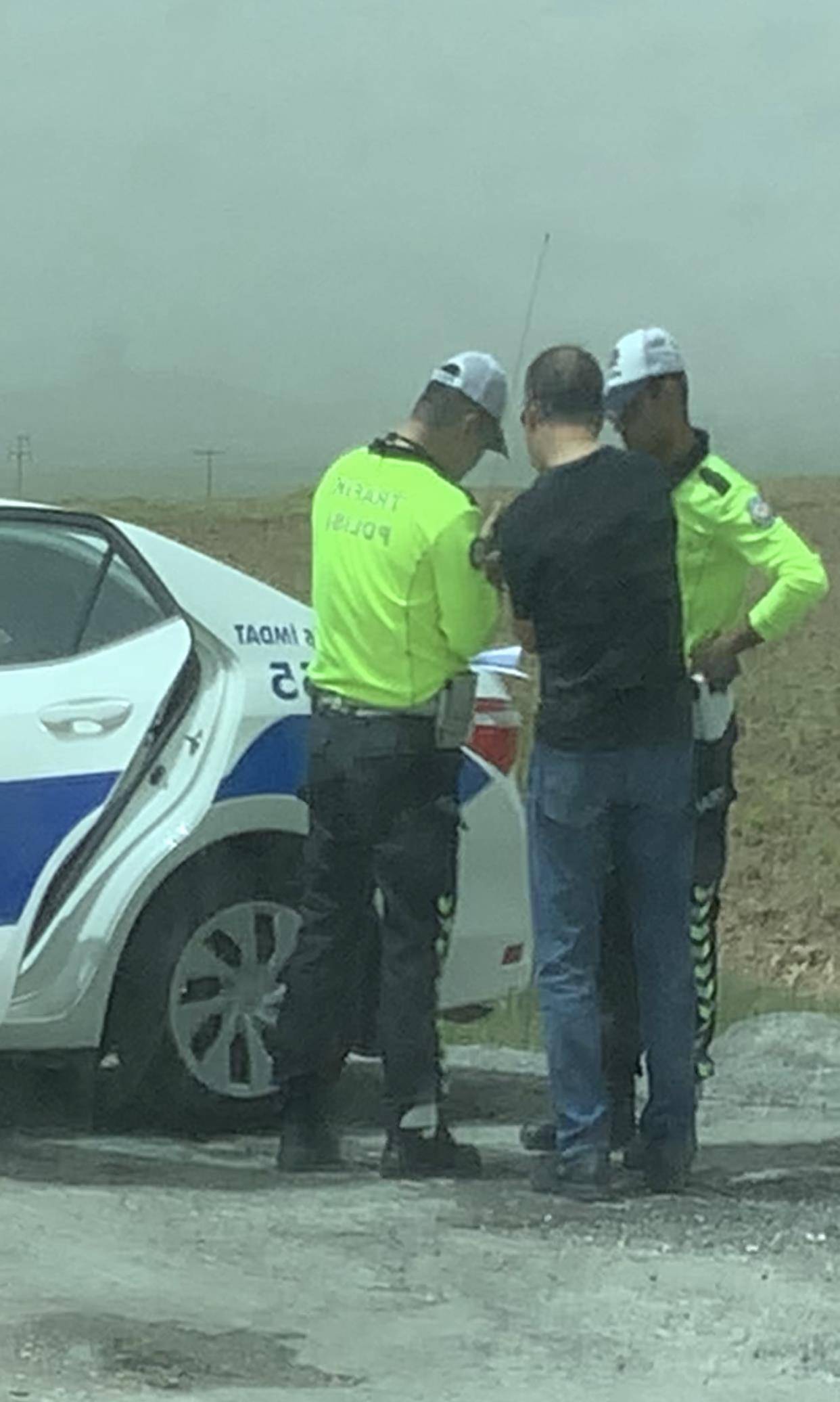 土耳其公路,城市公路限速50公里,城际间公路限速90公里,高速公路限速120公里。今天我们走的是城际间公路,进入安卡拉市界,车速大概110公里左右,有一辆与我们款式差不多的车,前后伴行十几公里,我看路边有一个流动测速仪,就把车速放慢跟在那辆车后面500米距离行驶。大约过了3公里路边警察示意停车,他们车在前先停了下来,我也随后停了下来。警察与他们说了几句话,随后就开走了,我的车却被扣了。