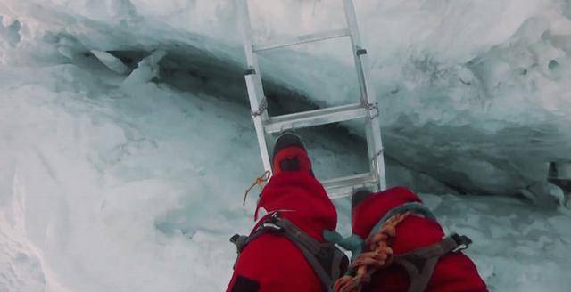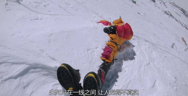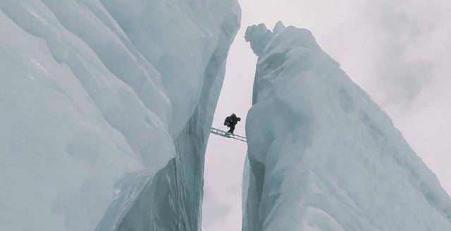 仅仅是坐在荧幕前,透过第一人称主观镜头去看这些攀爬画面,就给人一种窒息感,更别说那些负重前行、切身走在薄冰之上的队员们了,简直是以命相搏!