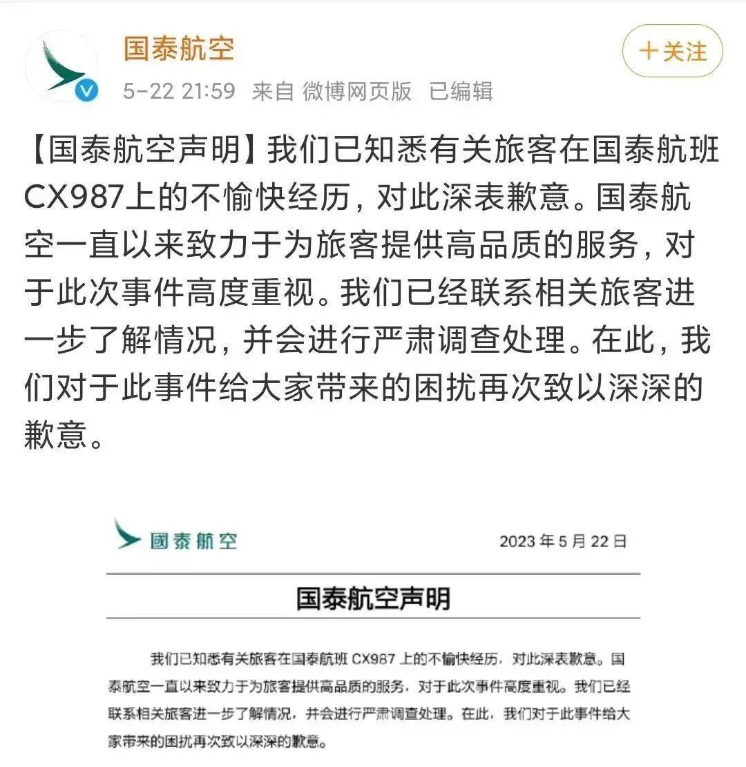 就此事,国泰航空于5月22日晚在官方微博发布声明,表示:“我们已知悉有关旅客在国泰航班CX987上的不愉快经历,对此深表歉意。我们已经联系相关旅客进一步了解情况,并会进行严肃调查处理。”