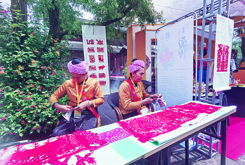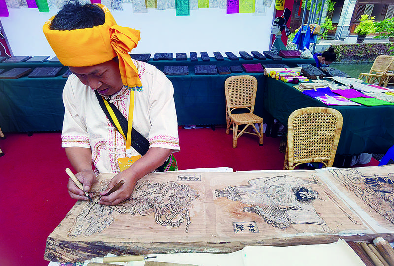 在腾冲市非遗活态展区里,看着腾冲甲马传承人贾明安专心雕刻木板的神情,来自东北的几名游客情不自禁地体验了一把腾冲甲马的制作。