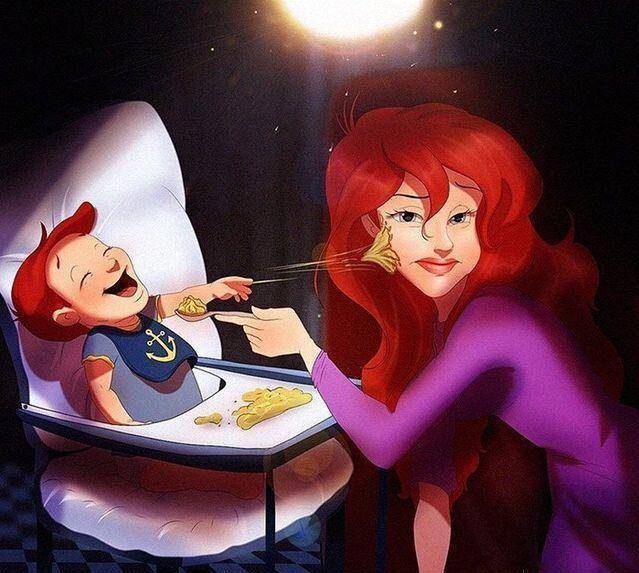 迪士尼最活泼的小美人鱼公主爱丽儿,看起来成为母亲已经有一段时间了。这继承了爱丽儿绯红发色的男宝宝真是相当俏皮啊,将喂来的食物随手就扔到妈妈的脸上,而且还哈哈大笑起来,弄得爱丽儿真是一点脾气都没有。即使是曾经中过诅咒的爱丽儿公主,也没有想到自己当妈后会有这般无奈的状况吧,没办法毕竟是自己生的娃,只能熬下去了。