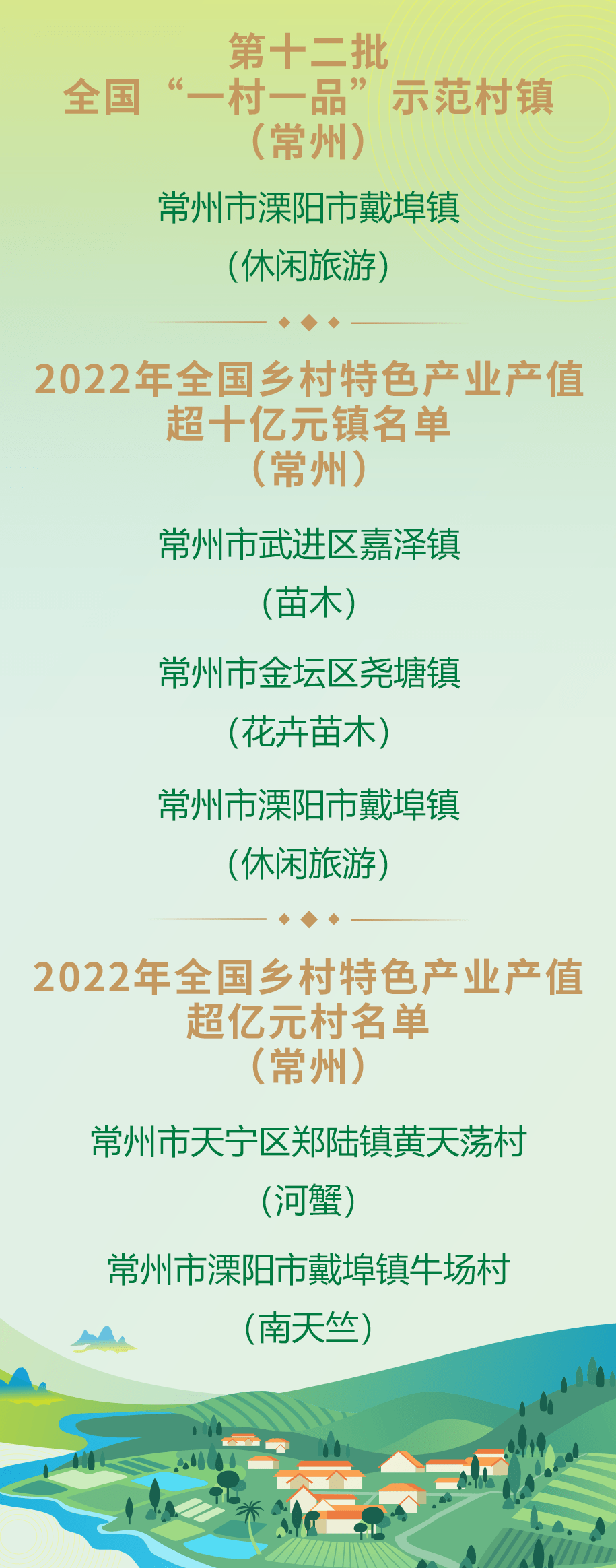 日前,农业农村部公布第十二批全国“一村一品”示范村镇,以及2022年全国乡村特色产业产值超十亿元镇和超亿元村名单。常州这些村镇入选——