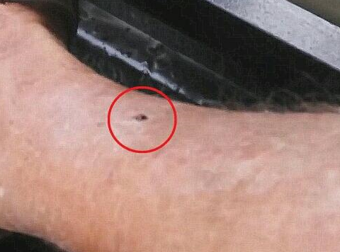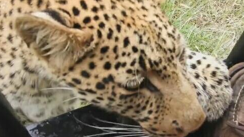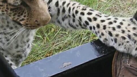 男子“啊”一声,立刻收回腿。仔细观察男子小腿,发现已经流血。由此感叹,花豹的爪子真的太锋利。