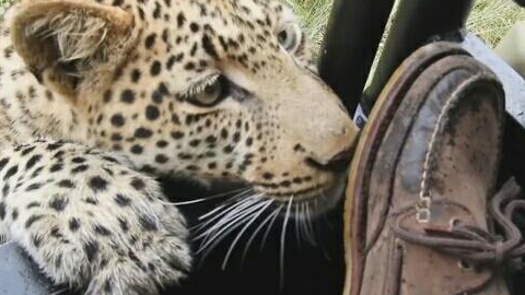 也许是气味太重,花豹久久不肯离去,甚至拨弄男子的鞋子。男子毫不在乎,任凭花豹摆弄,还时不时地向朋友显摆他的胆量。