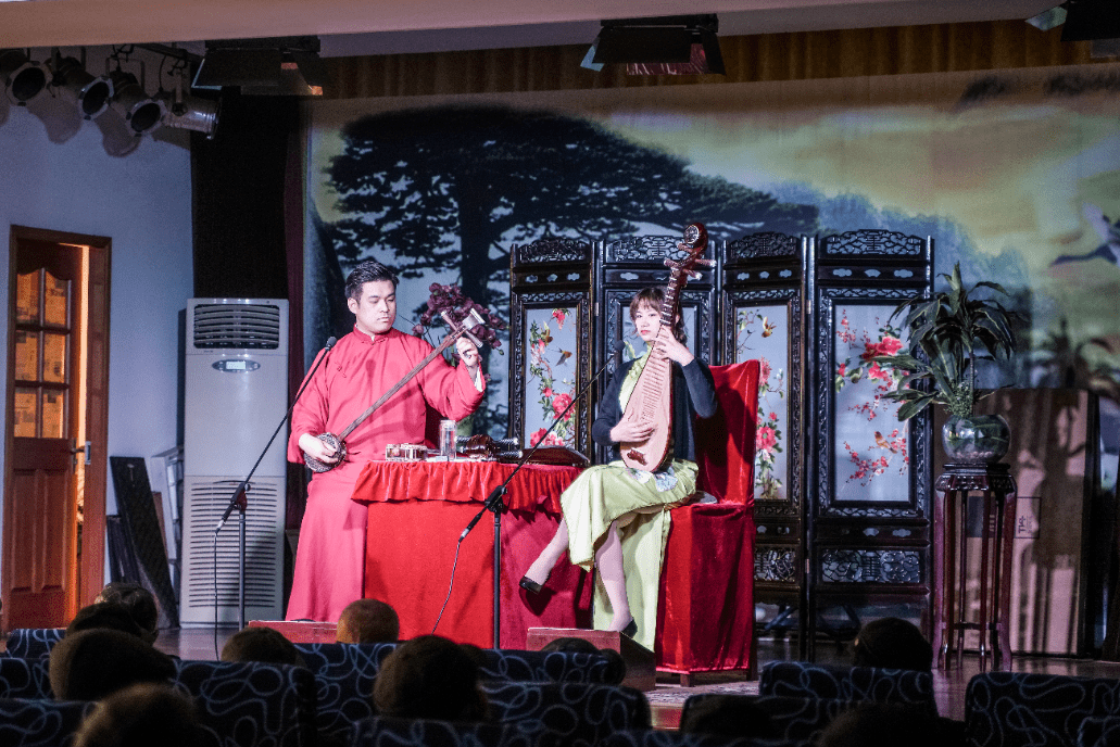下午1点,来自苏州评弹团的表演者准点开唱,台上弦音悠扬、书声悦耳,台下的听客沉醉其间。