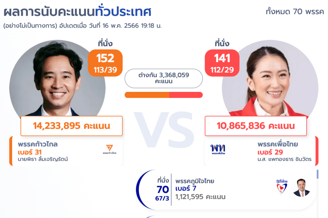 最终,前进党领导人皮塔以10票的优势,打败了声望最高的为泰党领导人佩通坦,赢得选举。
