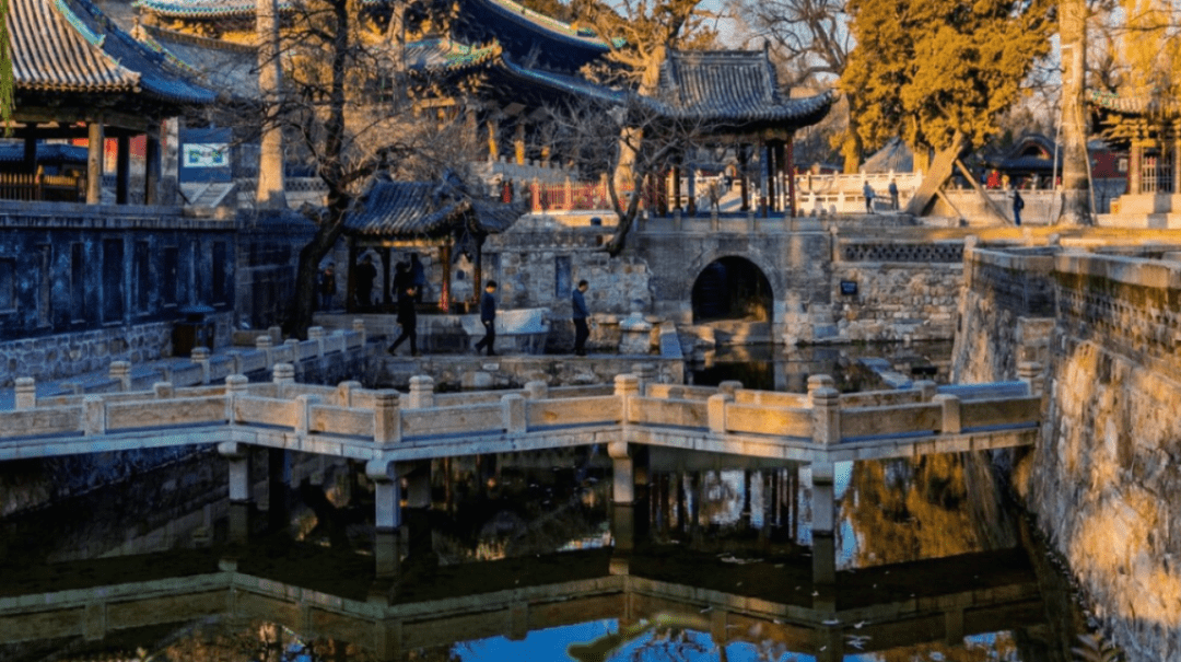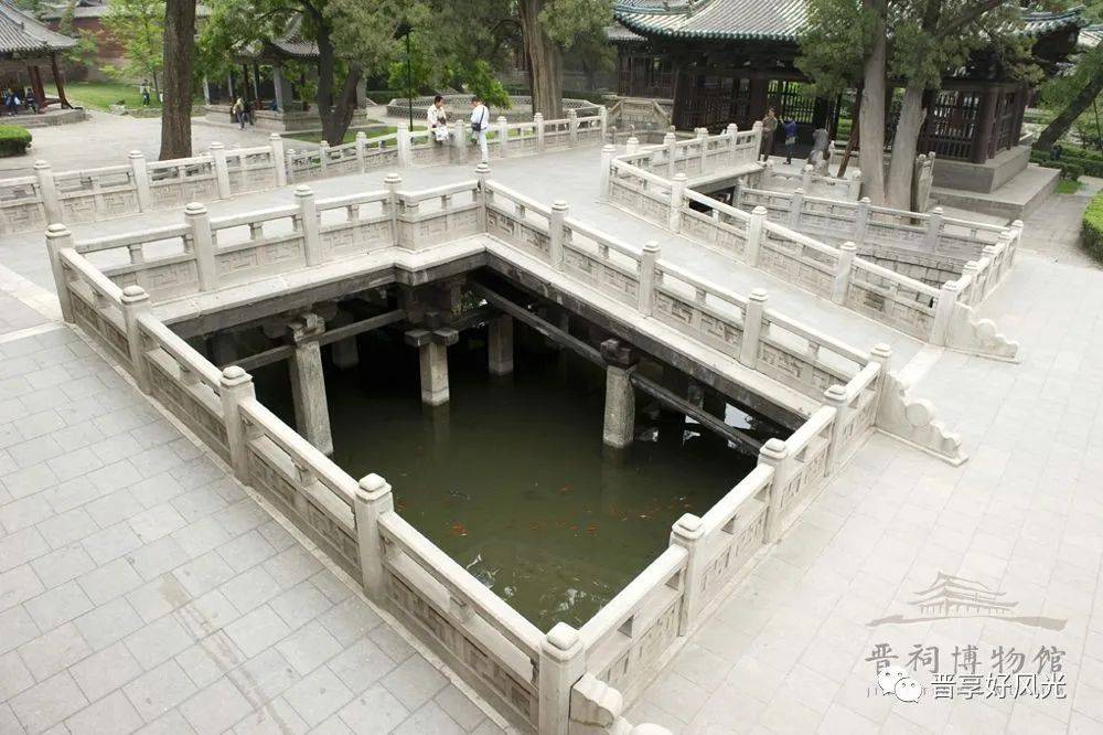从晋祠的平面图中可看到,晋祠中轴线北侧的建筑较规整,有二进院落的唐叔虞祠和关帝庙,轴线南侧由于智伯渠占据了很大一片地方,只有一些单体建筑如三圣祠、同乐亭、胜瀛楼,看似很不均衡,但古代匠师通过巧妙的对位调整,在轴线以北加建园林要素如八角莲池、松水亭在风格上保持了统一,在改变绝对对称关系后保持原有的均衡追求。
