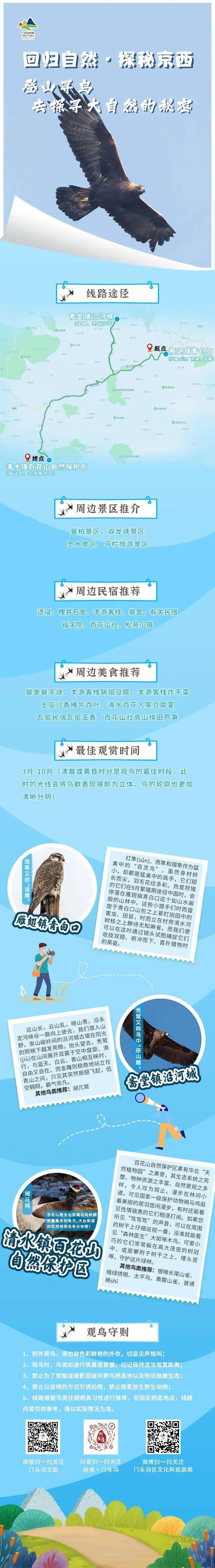 好生态引得万鸟归。在门头沟区域范围内,有国家一级重点保护动物黑鹳(guàn)、猎隼(sǔn)、金雕、褐马鸡、秃鹫等众多珍稀濒危物种。此次推出的线路以“鸟”为主题,整合永定镇、王平镇、妙峰山、百花山、三家店水库等区域丰富独特的鸟类资源。在观鸟之余,推出鸟类专家知识科普问答和以“鸟”为题的非遗剪纸、DIY手工文化活动和义务植树活动,积极宣传爱鸟理念,传播护鸟知识,探寻人与自然的和谐共生,诚挚邀请广大游客来门头沟观赏众鸟百态、学习鸟类知识、体验非遗文化。