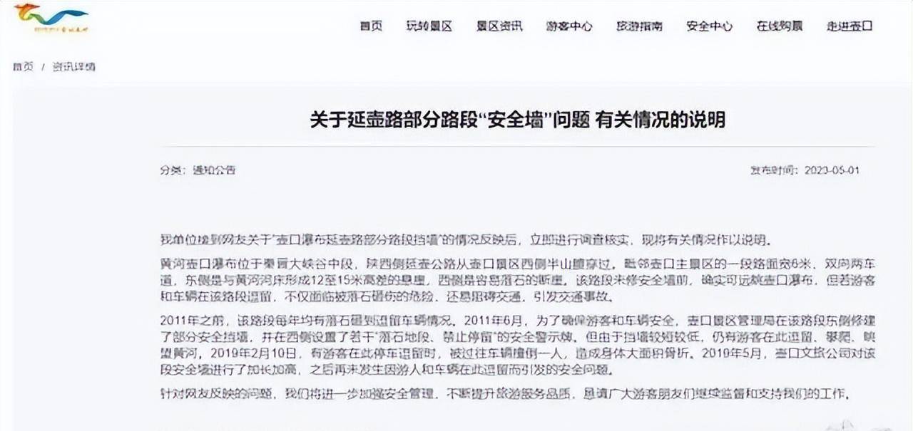 官方给出的解释,是因为安全问题。说是大家在这一路段走走停停,影响了行车安全,也就在此修建了围墙。真实原因是这样的吗?你修建围墙之后,会不会有人停下来,趴在墙上看瀑布?中国道路安全事故每年都在20万起左右,那为了安全,是不是也可以在道路上修建围墙,不让你走,就安全了呗。