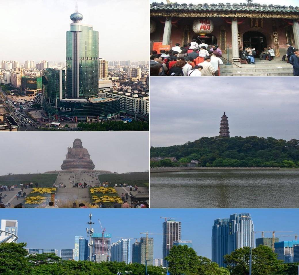 佛山风光(顺时针方向):佛山祖庙、顺峰山公园青云塔、佛山新城CBD一期、西樵山南海观音、禅城区百花广场