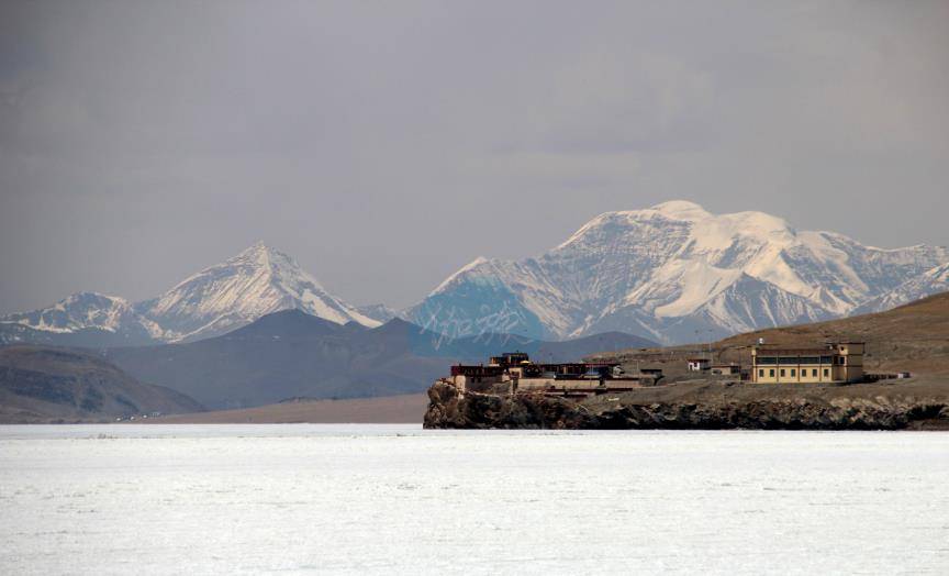 沿着曲折的湖岸线行走一段后便来到了浪卡子县,在经过打隆宗遗址后继续盘山而上,直到海拔5000米的普莫雍错和7538米的库拉岗日神山同时出现在面前。