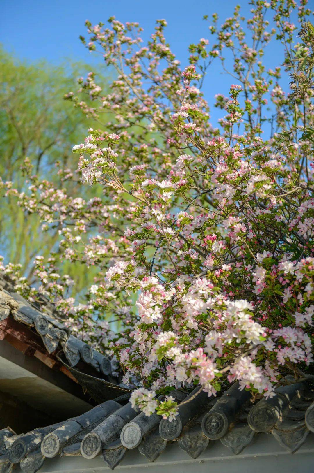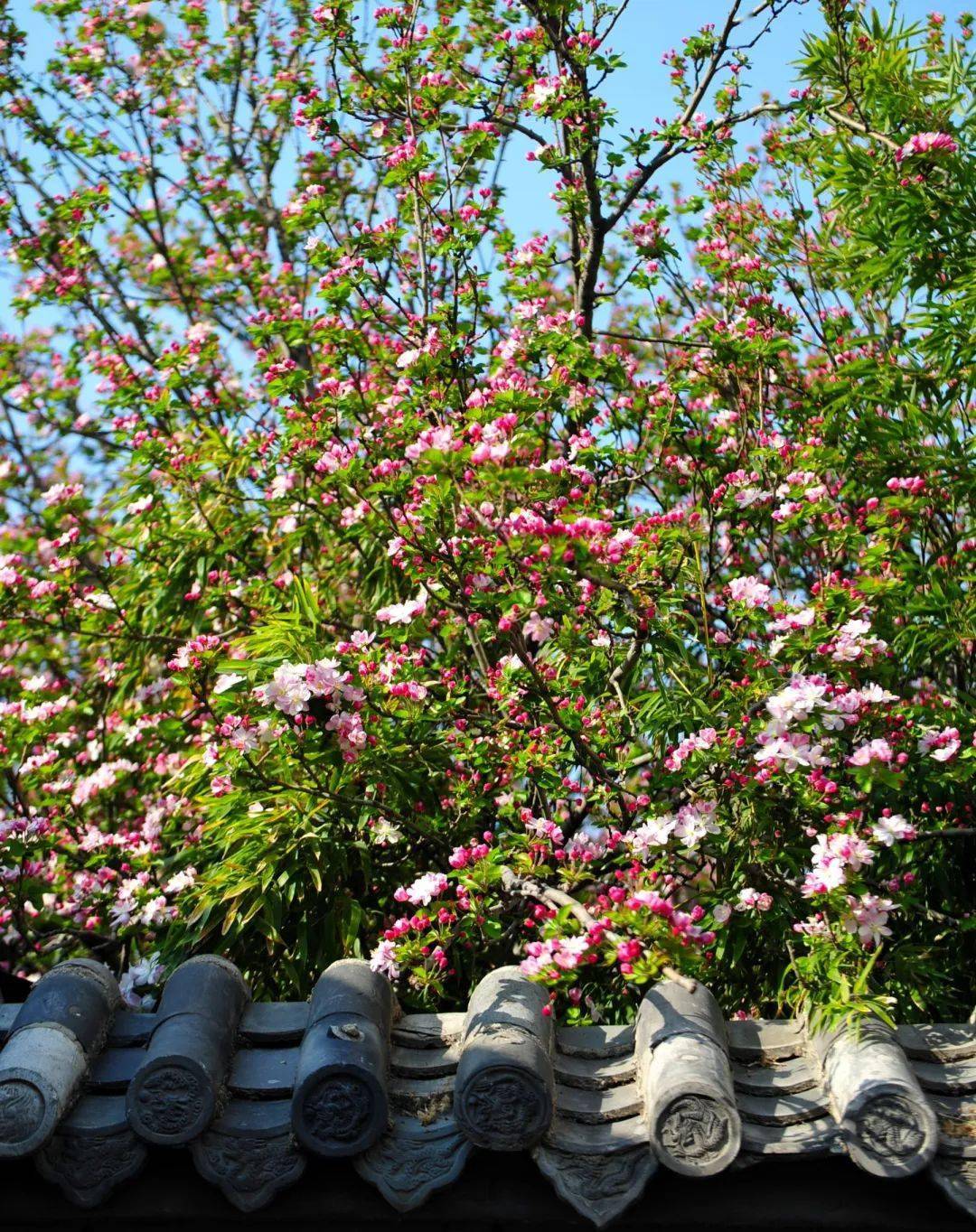 巧笑倩兮,美目盼兮,素以为绚兮。五龙潭公园内的西府海棠低调盛开,海棠花开多色,白里透红,衬着绿叶为底,最为动人。