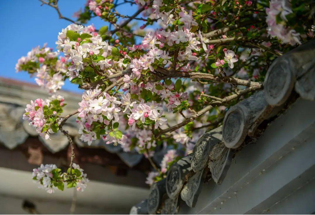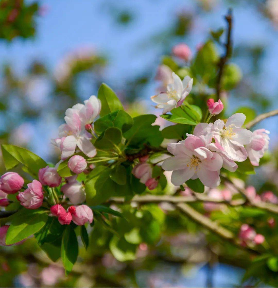 盛开的簇簇海棠花花枝舒展,俏丽枝头与绿叶相衬,高低错落。走近一看,花朵一点一抹,白里透红,浓淡有致。