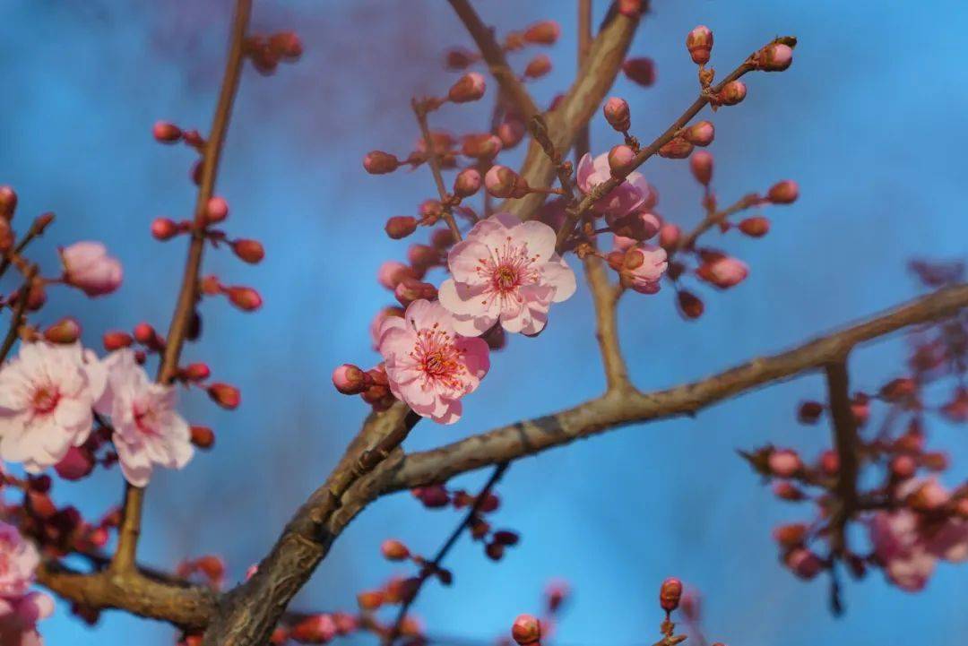 若说春色三分,梅花便占尽了一分。而美人梅作为梅花家族花期最晚的种类,天气转暖后的她才娇俏绽放。一根根纤细的枝条上,密密麻麻地缀满了她玲珑小巧的粉色朵蕊,绽放的花瓣如同云霞叠翠,鲜艳欲滴。