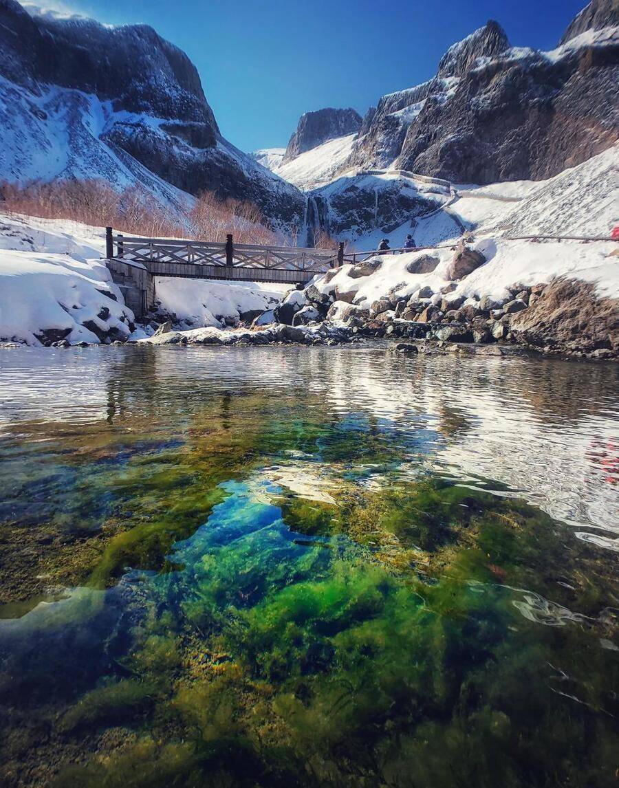 聚龙泉,是长白山温泉群中水量最大、分布最广、水温最高的温泉,被誉为长白山第一泉。它位于长白瀑布北侧约900米处,在落笔峰北侧倒石堆下方,分布面积超过1000多平方米。二道白河从温泉群中穿过,泉口较为集中,有数十处,其中较大的泉眼有7处。从地底涌出的无数条热流犹如群龙喷水,因此得名聚龙泉,在泉眼下部还建有供人泡浴的“怡神浴”浴池。