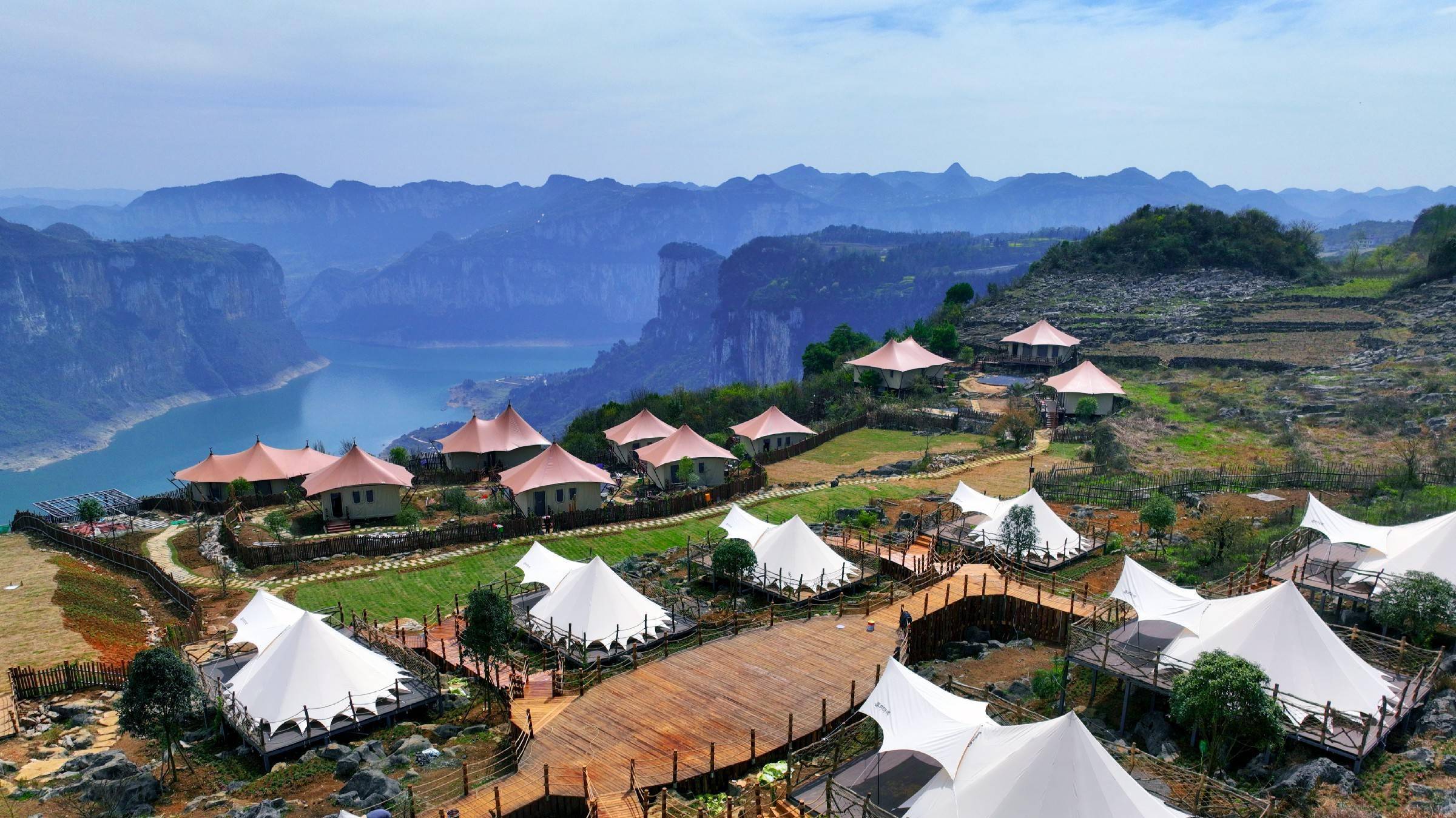 黔西市化屋野奢度假营地的吸引力在哪里?主要还是营地选址好,建在乌江源百里画廊悬崖上的营地,可瞰乌江南源鸭甸河、北源六冲河以及鸭池河汇流形成的山水风光,可看雄伟的鸭池河大桥,可观鬼斧神工的天然景观“大鹏展翅”“笋子岩”等。“基地给游客带来了不一样的体验,火爆是意料之中的事。”贵州山水画廊文化旅游发展有限公司执行董事曾凡华介绍,“营地现在主要针对的是年轻人和亲子市场,下一步会向团建和研学方面拓展。”