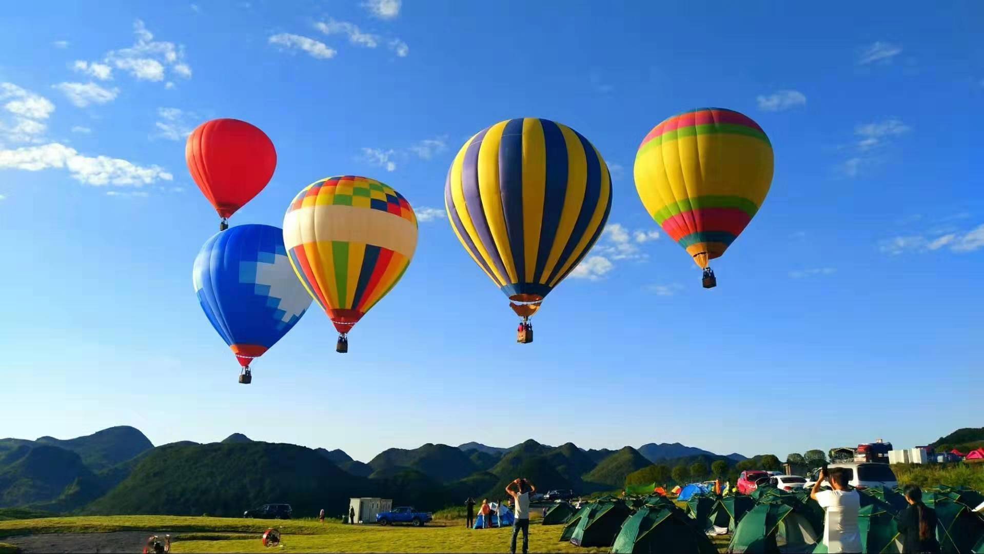游客在崔苏坝国际露营基地体验热气球