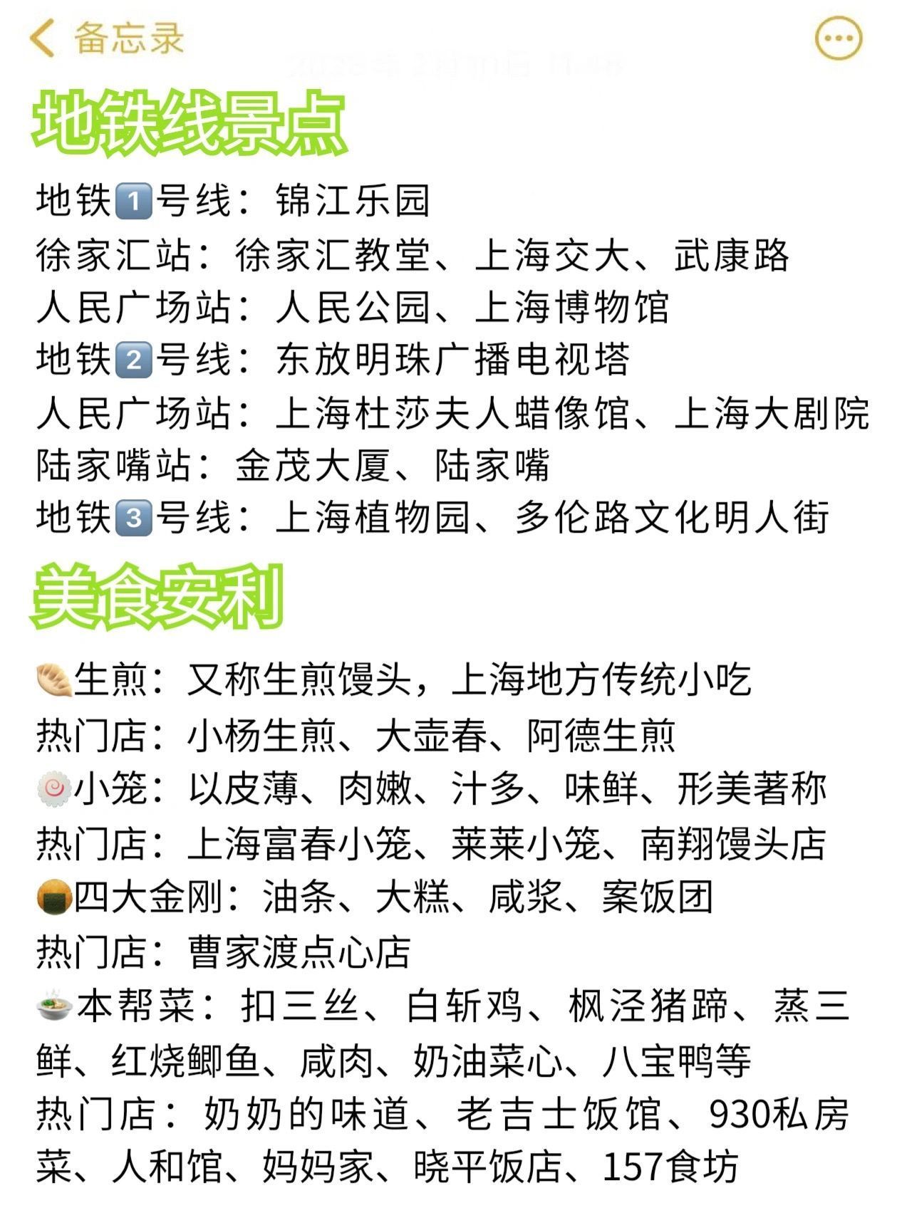 ✅ 出行准备 1⃣ 提前查好天气预报,带上晴雨伞,注意防晒。2⃣ 上海市区堵车严重,建议绿色出行,选择地铁或共享单车。上海的地铁网络覆盖广泛,几乎能到达所有景点。3⃣ 必备随身物品:身份证、学生证、充电器、充电宝、耳机、相机、自拍杆。
