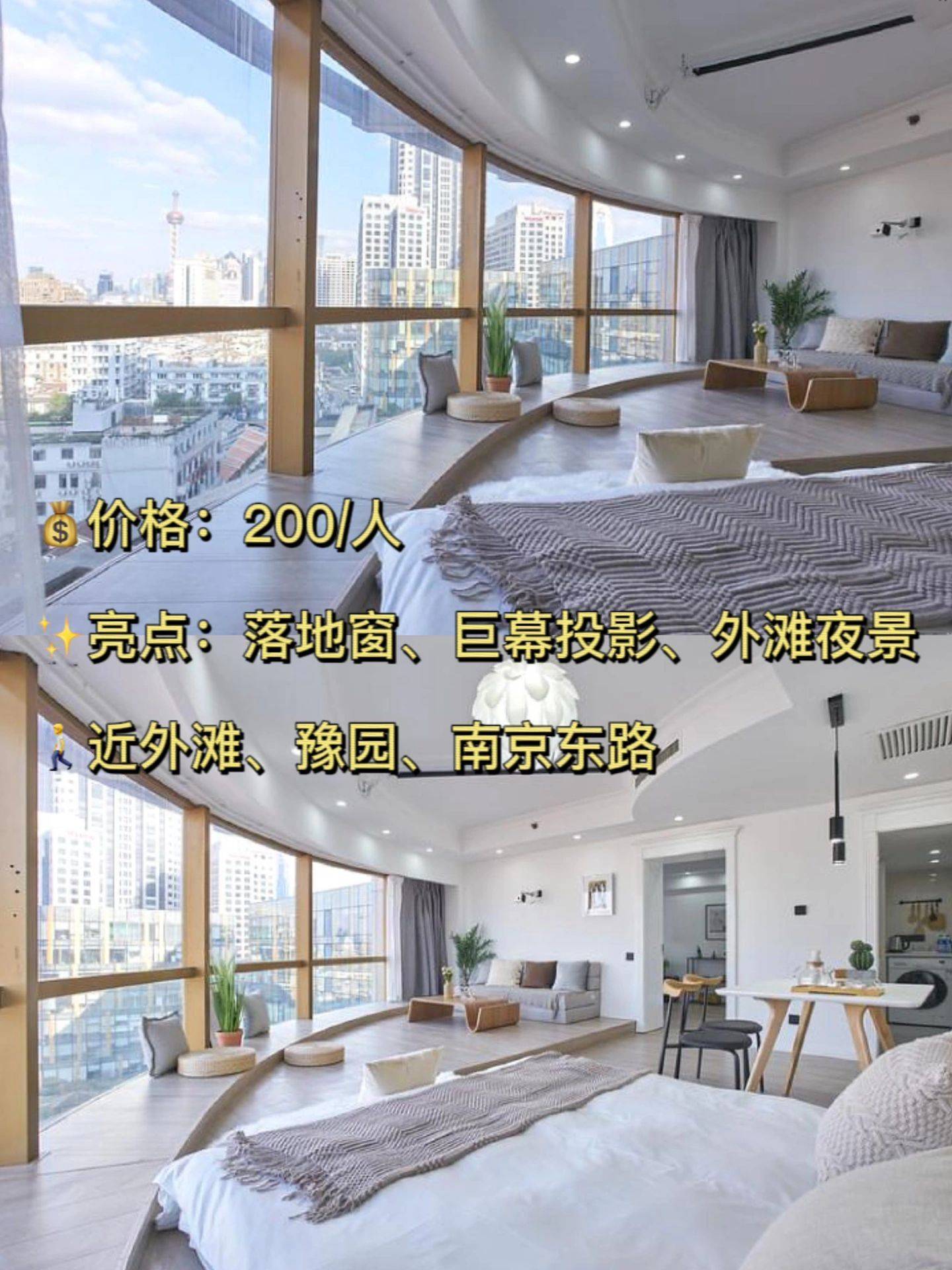 第二家:200/人💰 谁能拒绝一线观景房!超大环形落地窗,躺在床上就能欣赏东方明珠和外滩夜景!宽敞明亮的房间,阳光洒进来暖暖的~民宿设施齐全,有洗衣机和炊具,还配备巨幕投影。与伴侣一起享受美好时光,追剧娱乐无比惬