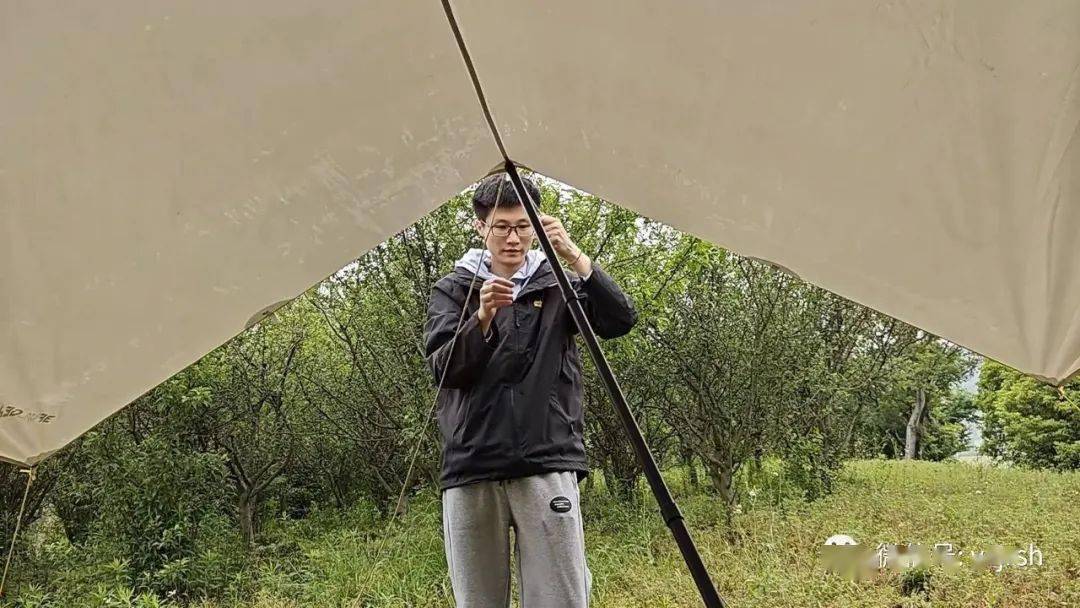 姚力铭:其实对于很多人来讲,难点就是在于打这个天幕,很多人其实扎天幕会进入了一个误区,都是先想把天幕竖起来,然后再打这个风绳,其实这样的话,天幕会左右乱跑,很不容易扎好,应该怎么弄?应该先把这5个角的风绳先打好,然后再用杆子撑起来,这样的话这个天幕就会拉得很饱满,你可以看我怎么扎。