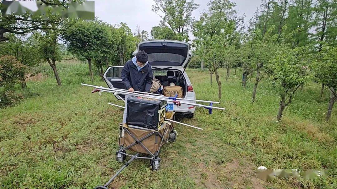 这个小伙子叫姚力铭,是一位露营爱好者,朋友都称呼他“老姚”。老姚是三年前开始接触露营的,当时就迷上了这项活动,之后每逢节假日就带着亲朋好友,在扬州找地方露营,昨天他们就来到了仪征铜山。老姚说的,刚开始,他只有一顶帐篷,一张桌子,哪晓得后头装备越来越多,现在出门一车子都不够装!这块,车子里头起码放了二三百斤的装备,不弄个小推车拉,根本运不走。作为一名露营熟手,老姚花了几分钟就把帐篷搭好了,然后就在天幕旁边发起了呆。