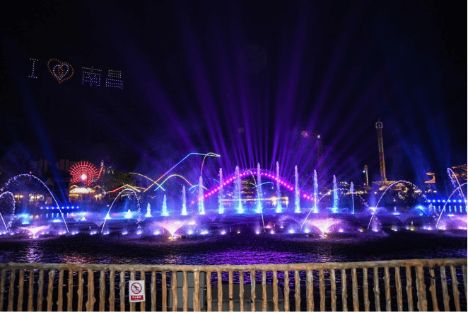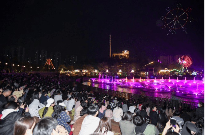 (游客在南昌融创乐园大湖观看无人机表演与大湖秀)