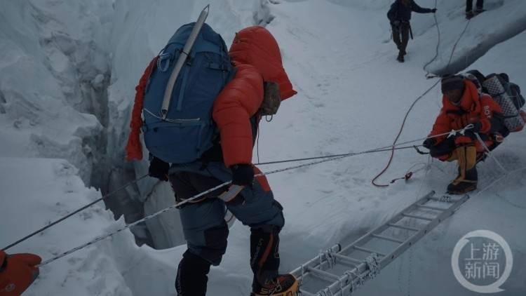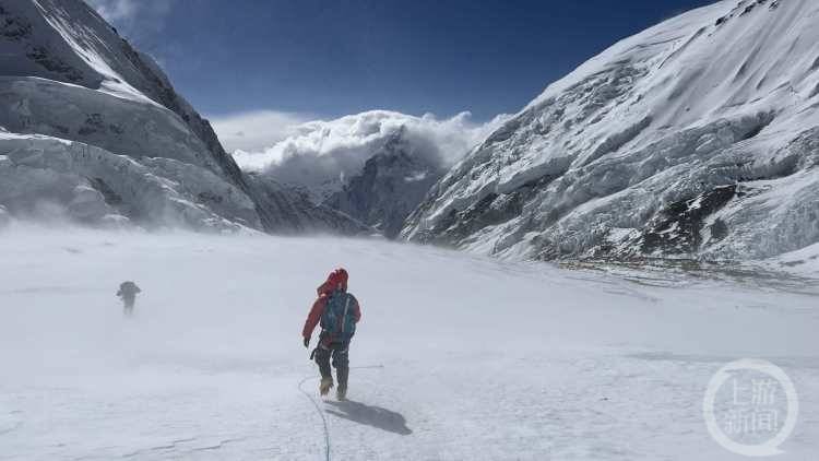 他试图站在“阳台”冰壁下方等待领队的到来,但因为实在太冷,只能继续向前找到副领队寻求帮助。不过,队伍里并没有多余的氧气罐,于是副领队决定下撤,让背有备用氧气罐的夏尔巴向导上来找王明龙。