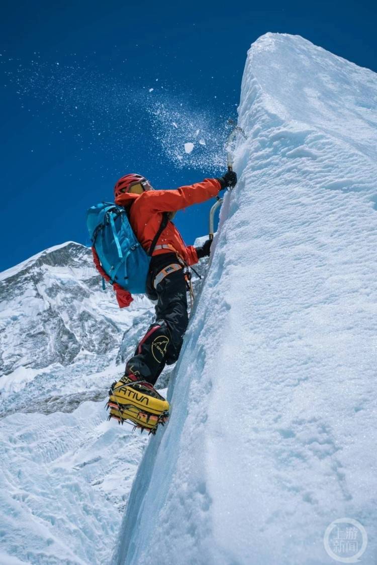 为了节省氧气,他将氧气瓶阀门关小,跟在冲顶的人群中,每走一步都要停下来大口喘息。在爬上一处垂直12米高的冰壁后,因为氧气阀门开得太小,王明龙缺氧严重,跪在地上使劲吸氧。