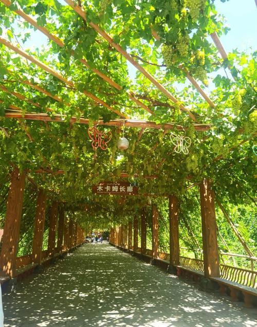 这是葡萄谷走廊的起点。首先映入眼帘的是这条葡萄园走廊的起点,这是一座具有鲜明少数民族风情的圆顶楼阁。藤蔓缠绕在柏油路两旁的吊架上。走廊绵延数公里。这条路的另一端是一个人多的村庄,可以说是葡萄谷村。