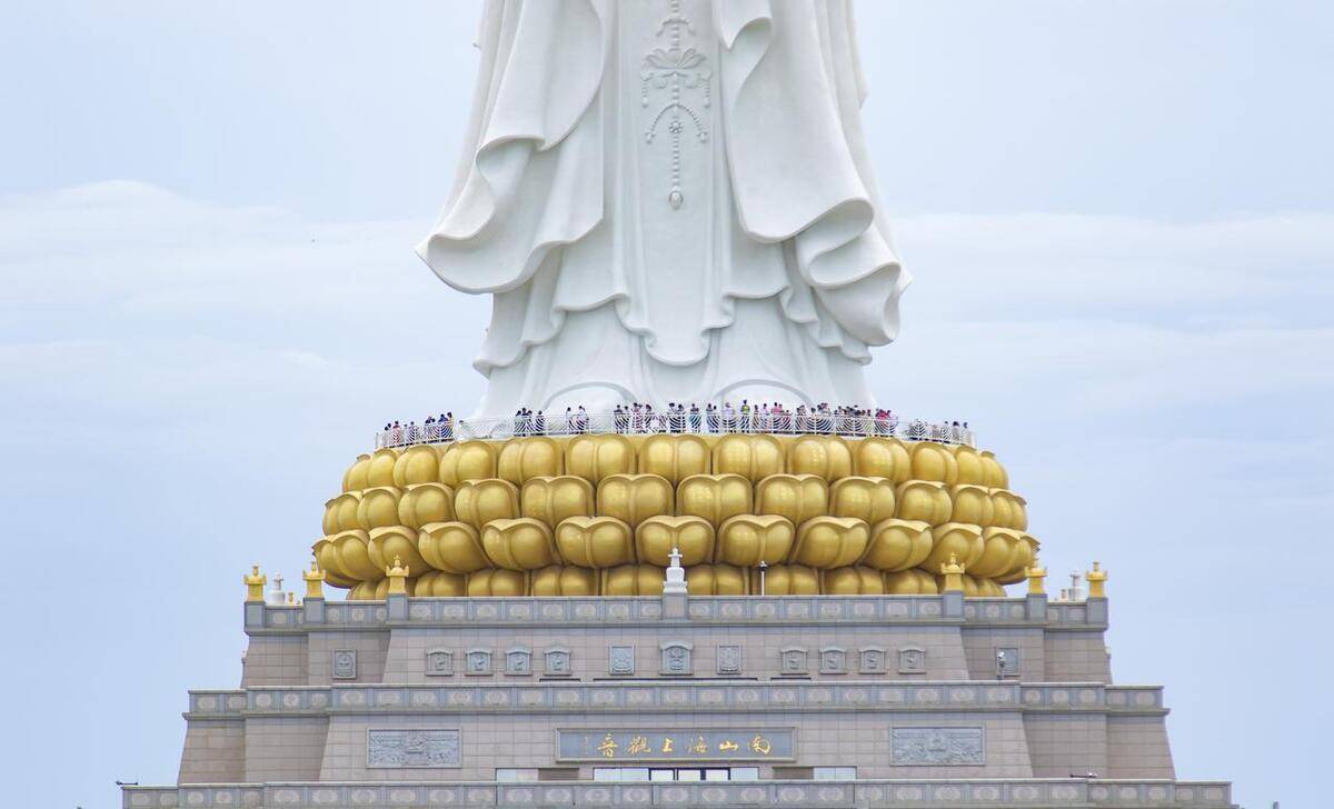 穿过刚二道门,远远就能看到高108米的观音像。观音脚下的莲花台上,人山人海。抱佛脚祈福。