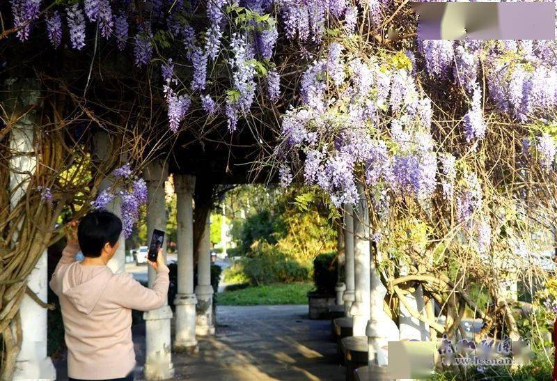 春风兮兮,八仙洞宾馆也迎来了赏花时节。沐浴阳光的紫藤花在轻风中摇来摆去,紫中带蓝,灿若云霞。花穗挂在枝头,沉甸甸的似葡萄初熟压弯了枝头,让藤下的赏花人陶醉在花香之中。