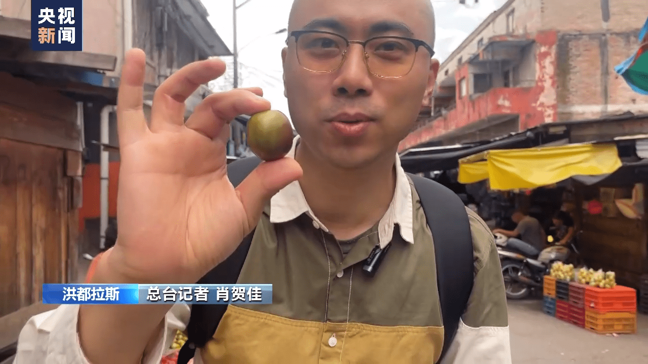 总台记者 肖贺佳:让我盲猜我觉得是枣,因为有点像我们国内的冬枣。我问了当地的向导,他说这不是枣,是洪都拉斯当地李子的品种。嗯!尝过后感觉完全没有李子味儿,但是味道是甜的,皮很韧,想把皮咬穿不是那么容易,里面的果肉比较细腻,但是水分不是那么多。跟国内的李子完全是两回事儿,还挺好吃。