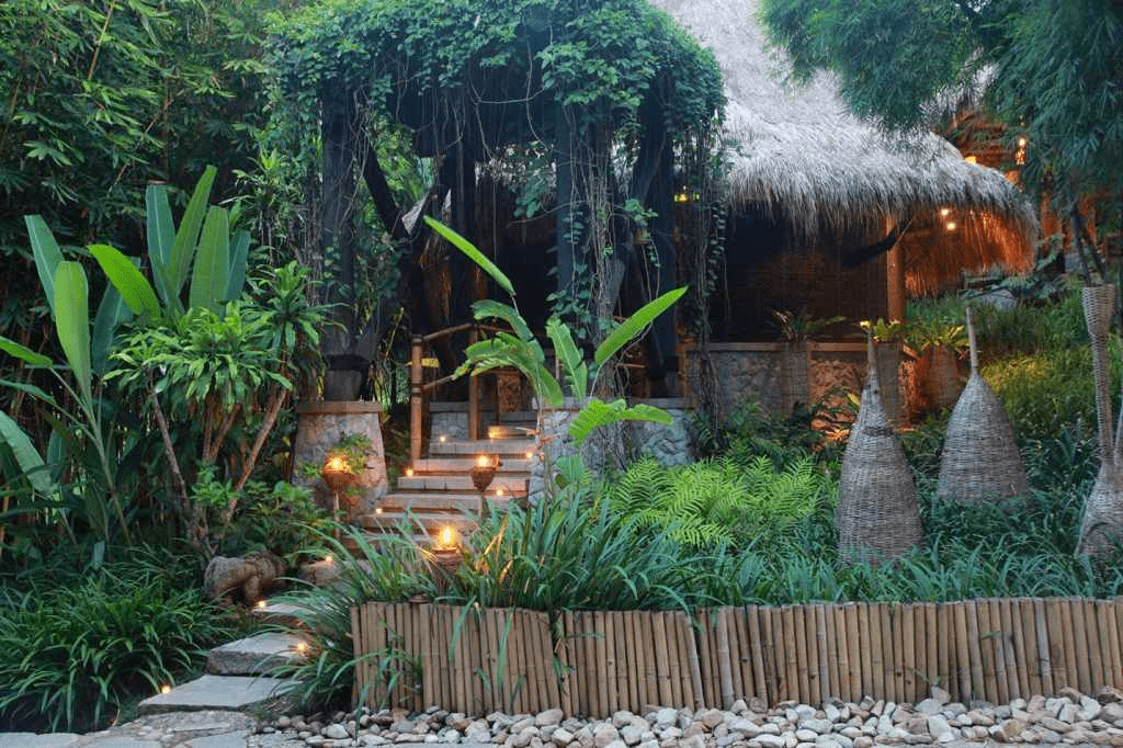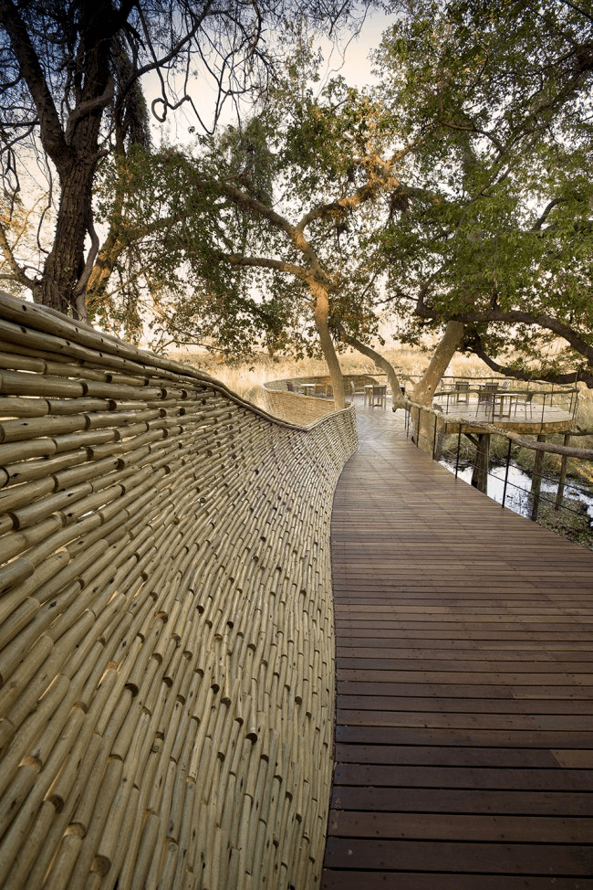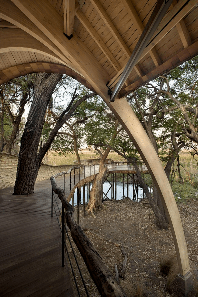 前来此处的客人们将会在距离酒店不远,但丝毫看不见酒店踪迹的地点统一下车。然后在员工的带领下穿过丛林,到达入口,方能一睹点缀在林间的木屋的风采。拾阶而上,客人们穿过层层叠叠木瓦搭建而成的建筑立面步入大厅,来到悬空约1.5米的用餐平台。向左前行,高台上一道道木梁在空中划出优美的曲线,引领人们来到坐拥美景的酒吧和休息室。顺着木栈道继续前行,人们来到古老的无花果树下的观景平台,静看远方三角洲处的粼粼水光。而在外侧的树林下,巨大的木头堆叠出一个将在夜晚燃起篝火的火炉。