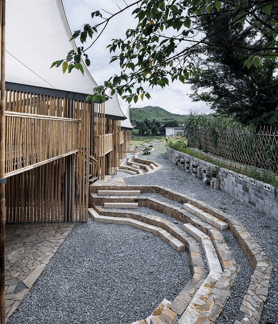 设计在尊重原有场地的基础上进行,结合度假休闲农庄的定位,加之音乐演出、儿童娱乐、帐篷营地、篝火狂欢等功能的嵌入,以借景的方式将空间的边界外延至周边环境,用自然模糊空间的界限。借周边山林之势,营造一方低密山居乐土,形成无界式农庄景观。农庄入口的设计与周边环境充分融合,耐候钢板、碳化竹、杂色系块石等生态质朴材料如同从自然中生长而出,给人亲切和温馨感,同时不失入口空间的丰富与层次性。