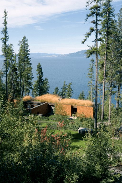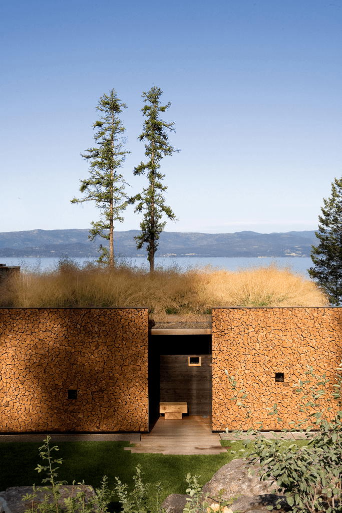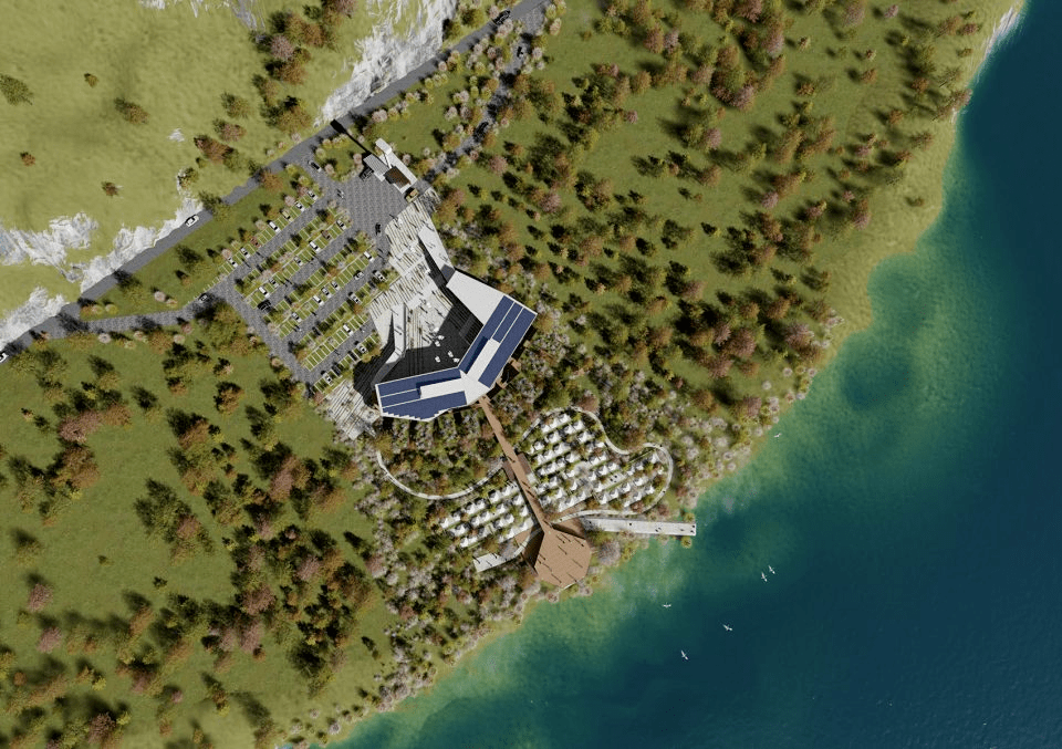 该营地坐落在一处偏远的山坡上,指引着游客逐步接近和发现场地。从门楼开始,一条路径连接了位于下方的主人住宅、林间小屋和旅馆。这几座建筑共同带来了宛如洞穴的温暖空间以及宽敞的门廊,沉浸在美景与阳光之中。小尺寸的窗户和厚实的墙壁朝向山坡,与临湖的主立面形成对比。居住者可以通过打开的滑动墙壁随时享受户外的风景,而无需走到遥远的荒野地带。同样地,每个卧室内也拥有独立的隔墙,使人可以安心地在大自然的环绕下入眠。