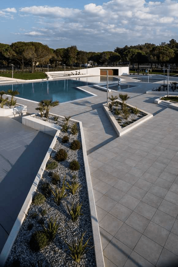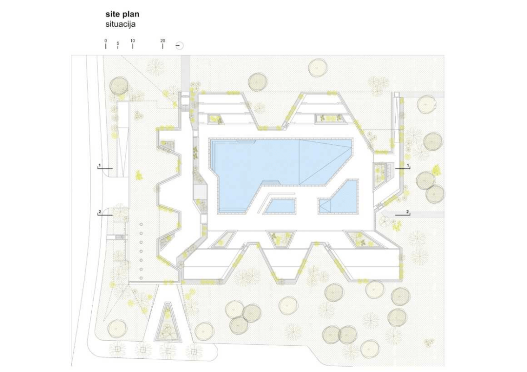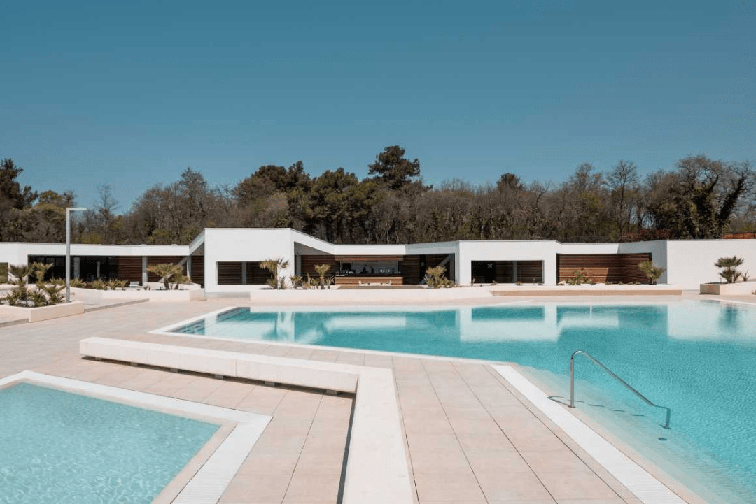 场地上的自然环境和松林是这个综合体设计概念的基础。我们将阳光平台和游泳池布局在其平缓的斜坡上,而室内设施则利用现有高差,设置在阳光平台上方的绿色屋顶下。该综合体由一个大游泳池、一个儿童游泳池和一个婴儿游泳池组成。除了游泳池,它还有一个带办公室的接待处,以及一个户外酒吧和餐厅。这样,游泳池就不仅仅是一个孤立的露营区——它也是进入该营地的第一个景观。
