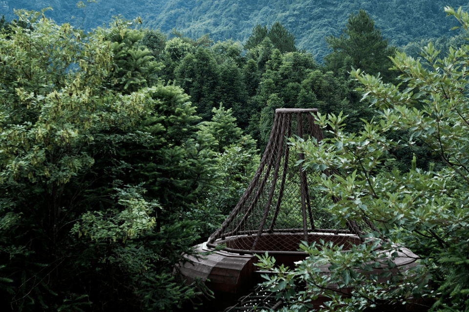 我们希望通过景观及建筑融合的整体设计,打造一处具有独特记忆点的强IP场所。当第一次来到这片山林,沉醉于齐云山的灵秀风景的同时,我们也思考尽可能有效的保护好大自然赐予的无限美好,让新设计的场所空间既能如同从林中生长出来一般与自然融为一体。景观尽可能最低限度的干预现有山体和植被同时,又能抓取到最美的风景是我们确定选址的第一原则。