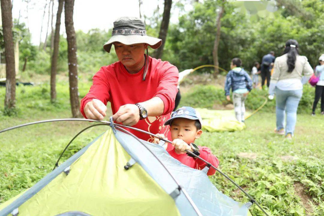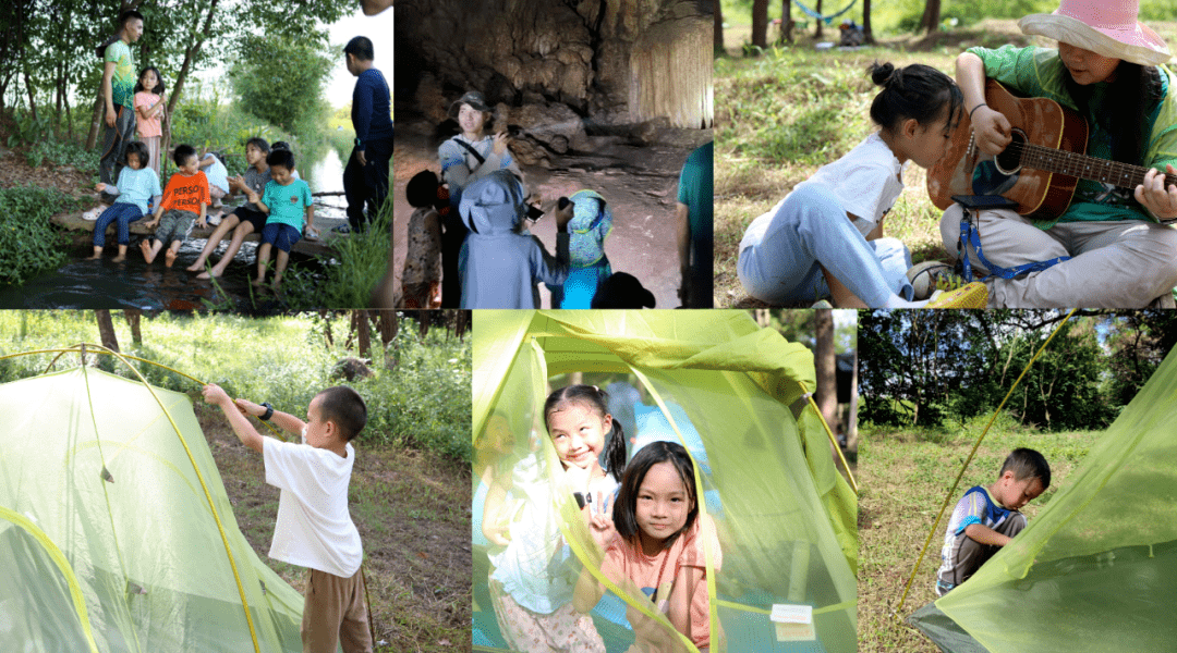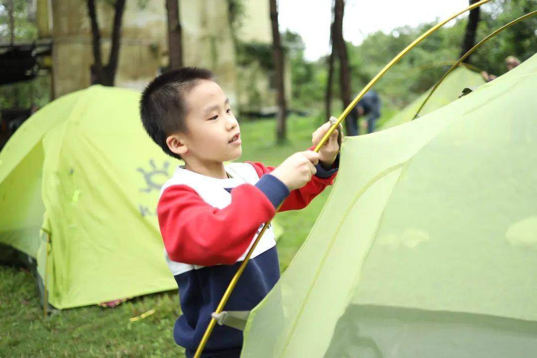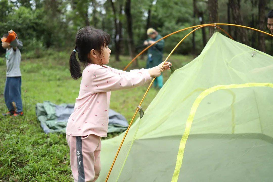 营地位于典型的喀斯特山脉-大山公山脚下的一片松林里,孩子和家长需要在营地搭建属于自己的帐篷过夜。露营的乐趣在于体验的新鲜感和挤在一个空间休息的温馨感,孩子和家长一起完成帐篷的选址、露营装备的准备、帐篷的搭建。能不能在自然里拥有舒适的一夜,需要认真的对待和共同的努力,只要关乎于生活,没有孩子会不为之而“斤斤计较”。
