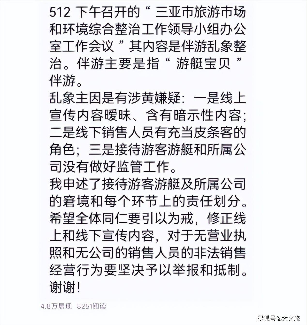全文:512下午召开的“三亚市旅游市场和环境综合整治工作领导小组办公室工作会议"其内容是伴游乱象整治。伴游主要是指“ 游艇宝贝”伴游。