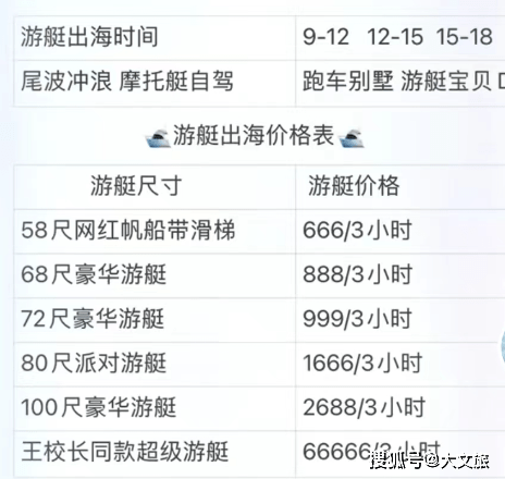 对此,这名游艇行业从业人员告诉文旅君,游艇小船比较颠簸,毫无体验可言。而大船就比较贵了,3个小时两万,性价比不高。王思聪校长同款超级游艇的价格则是66666元三个小时,这个体验就比较好了。