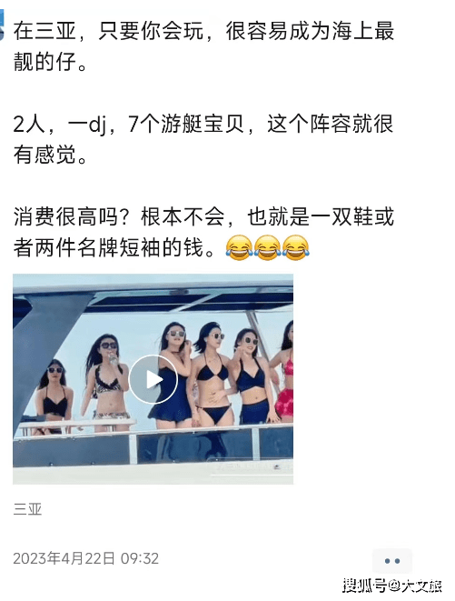 2023年4月22日09:32还是这位游艇从业人员表示:在三亚,只要你会玩,很容易成为海上最靓的仔。2人,一di,7个游艇宝贝,这个阵容就很有感觉。消费很高吗?根本不会,也就是一双鞋或者两件名牌短袖的钱。