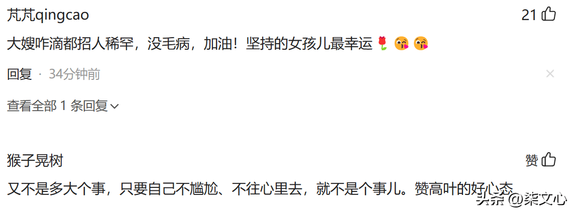 大家纷纷赞扬她的好心态:就是喜欢你,又不是多大个事,只要自己不尴尬,不往心里去,那就不是个事儿。